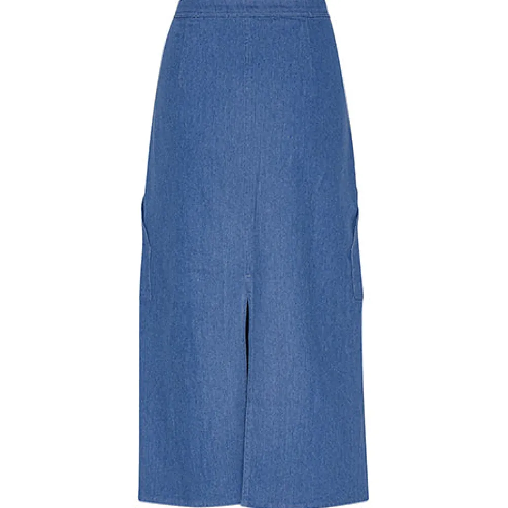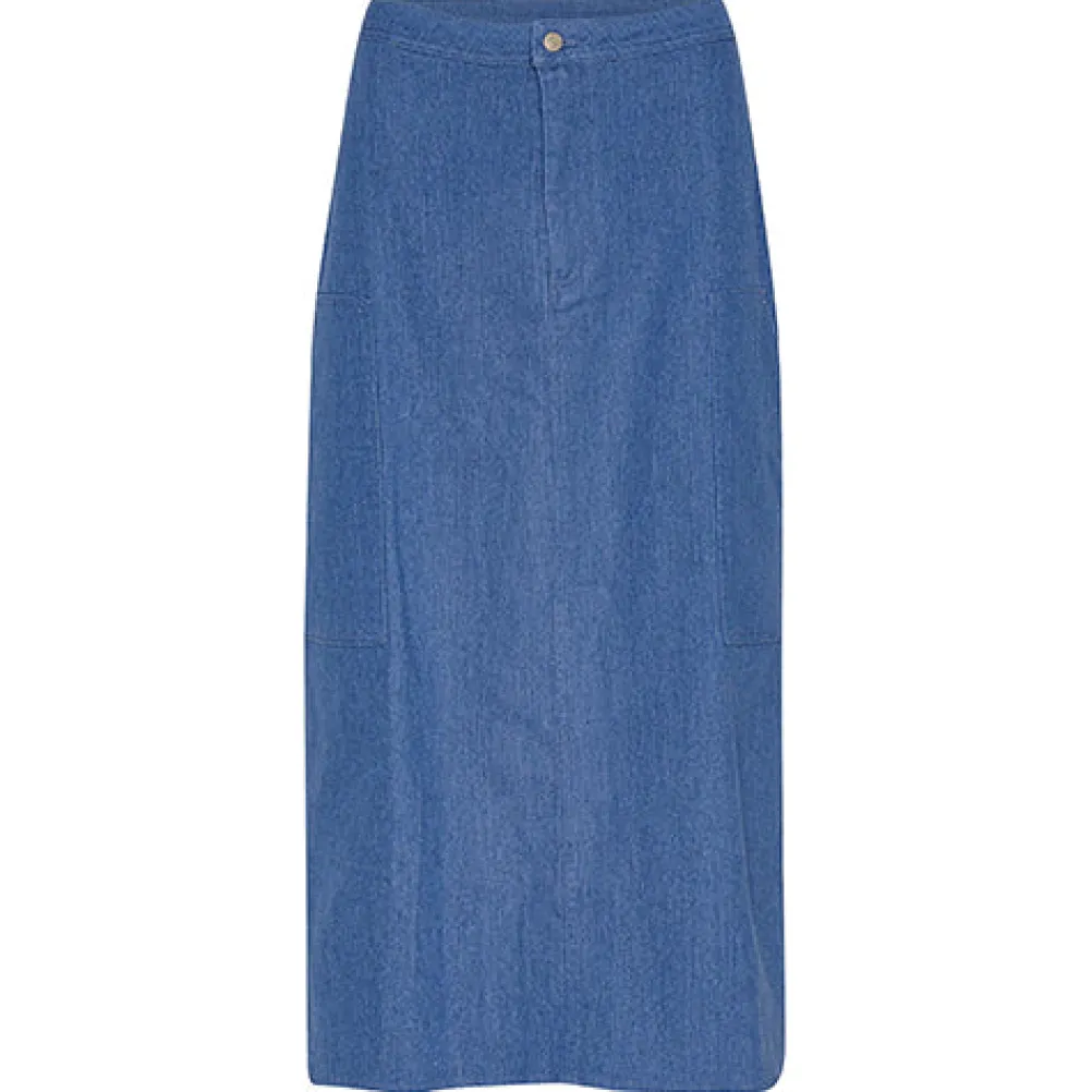 Flot blå lang denimnederdel fra A View. Med høj talje og lommer i siden. Med slids bagtil og midi længde.