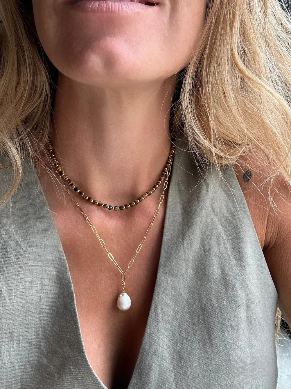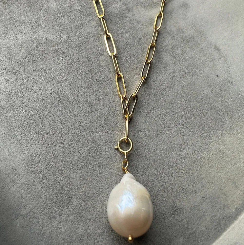 Materiale: 18 karat guldbelagt messing og ægte ferskvandsperle. / Længde: 51 cm
