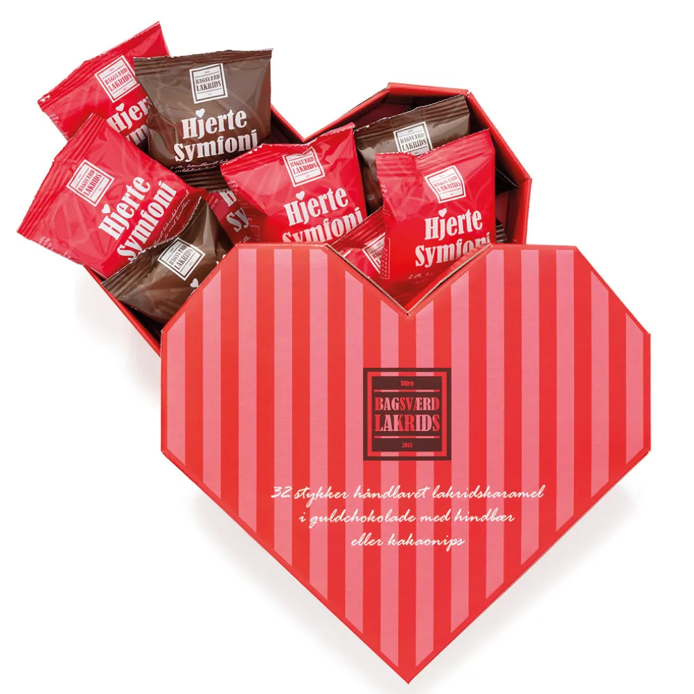 Håndlavet klassisk lakridskaramel i guldchokolade, med et forfriskende twist af hindbær eller den intense smag af 100% ren kakaonips. Æsken indeholder 32 stykker håndlavet lakridskaramel i guldchokolade drysset med hindbær eller kakaonips. Perfekt som valentinsgave.