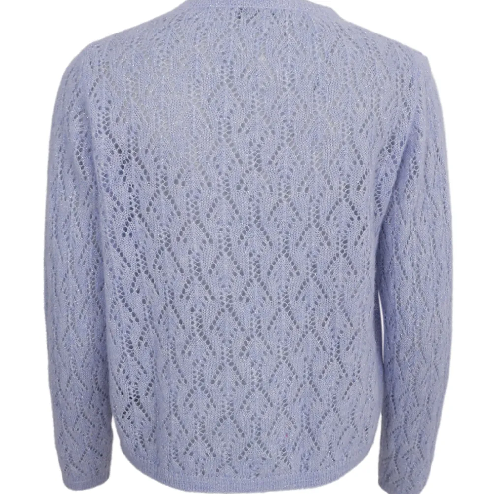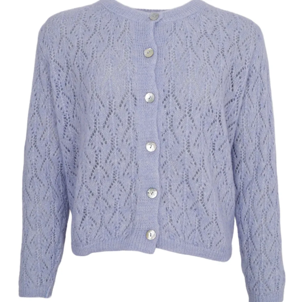 Skøn blød cardigan fra Black Colour med lange ærmer og knaplukning. Strikket i et flot og detaljeret hulmønster med glitrende lurex tråde. Perfekt til kølige forårs- og sommerdage.