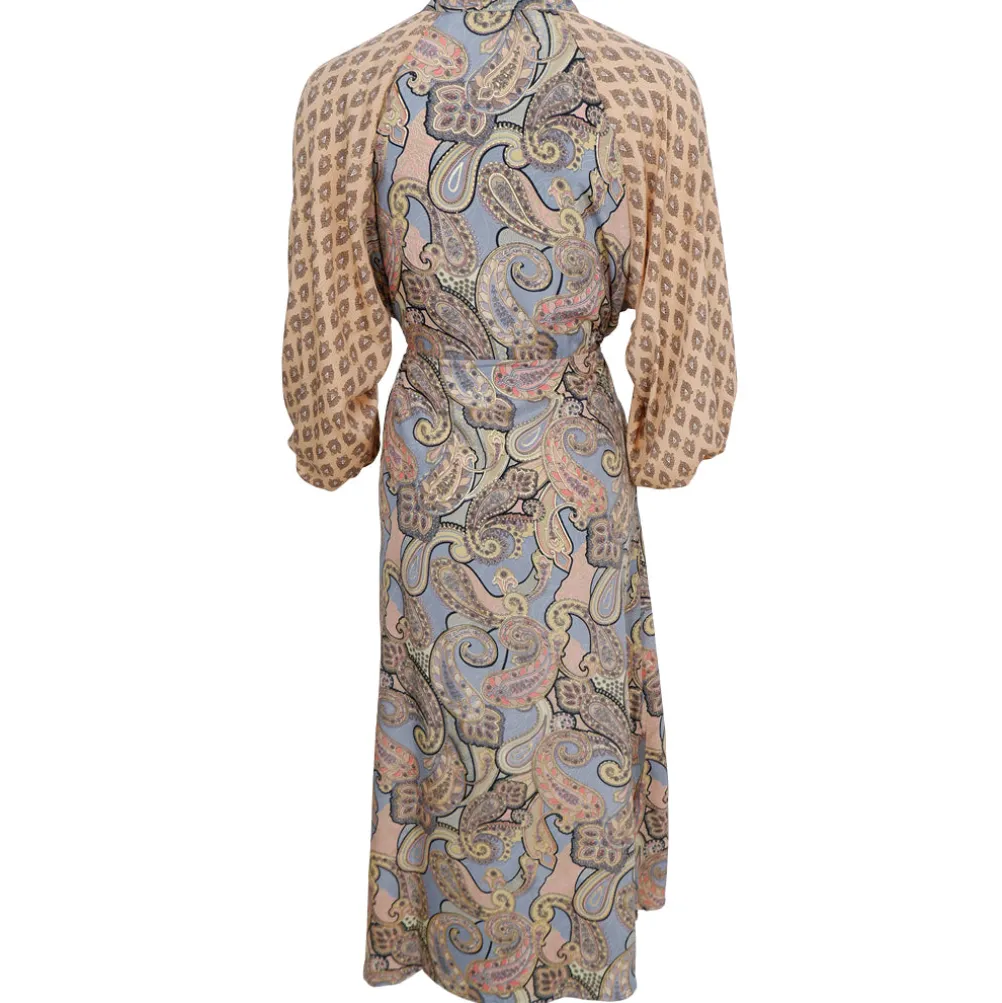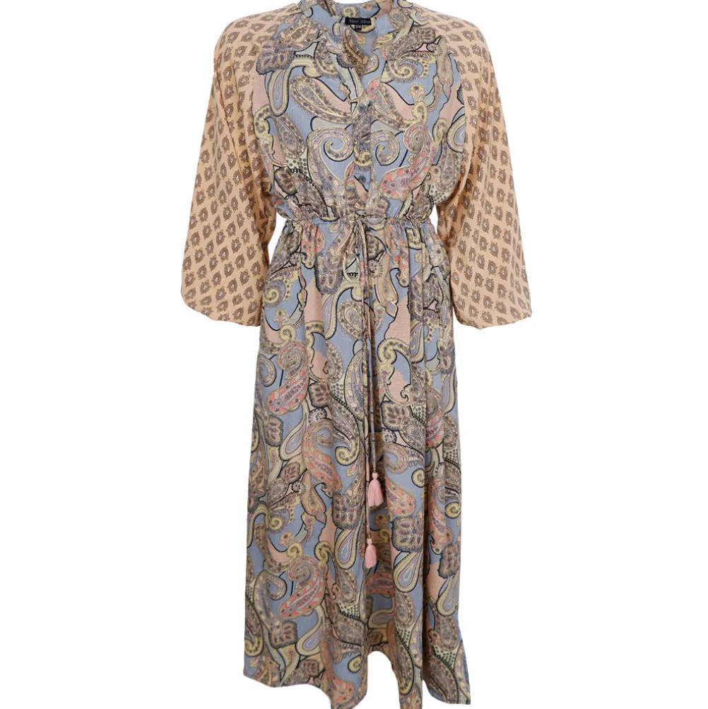 Smuk boheme-kjole fra Black Colour med flot mønster! Med lange volumiøse ærmer, lille v-udskæring og bindebånd i taljen med kvaster. Perfekt til både hverdag og fest.