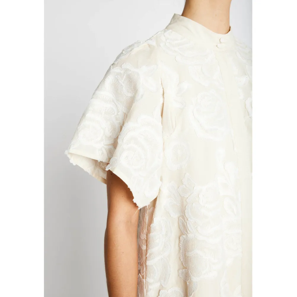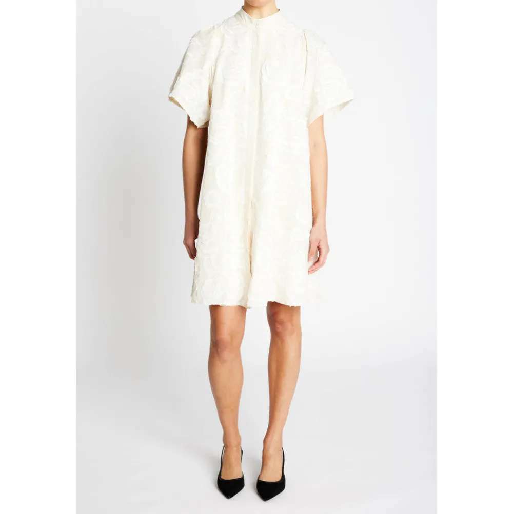 Smuk og elegant a-formet kjole fra Bruuns Bazaar med fine broderinger. Med korte brede ærmer og kinakrave. Perfekt både til hverdag og fest.