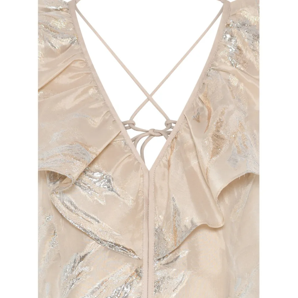 Super smuk top fra Bruuns Bazaar med glimmerdetaljer. Med flæseudskæring og bindebånd på ryggen. Perfekt til festlige begivenheder.