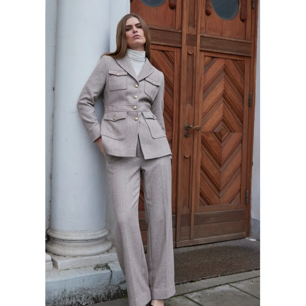 Klassisk smuk blazerjakke i uldblanding fra Bruuns Bazaar med fine guldknapper og lommer. Med indsnit i taljen, som fremhæver ens figur.