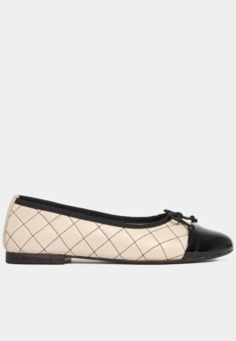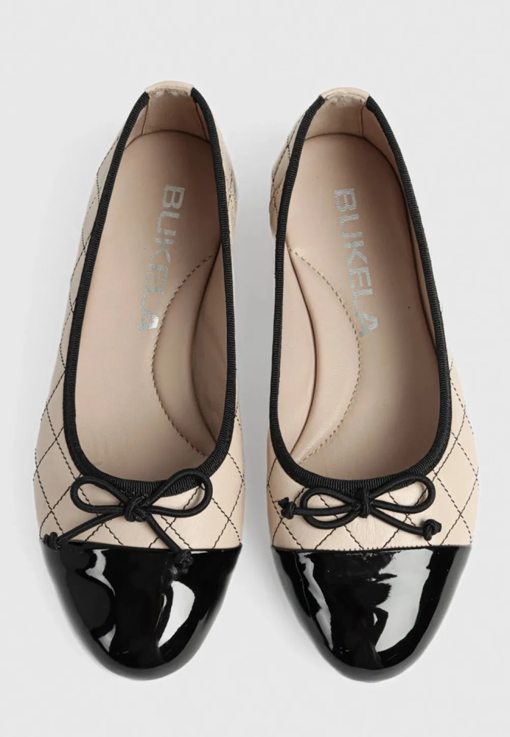 Smukke og eksklusive beige/sorte ballerinaer fra Bukela med fine detaljer! Med quilted mønster og behagelig pasform. Et must til forårets og sommerens styles.