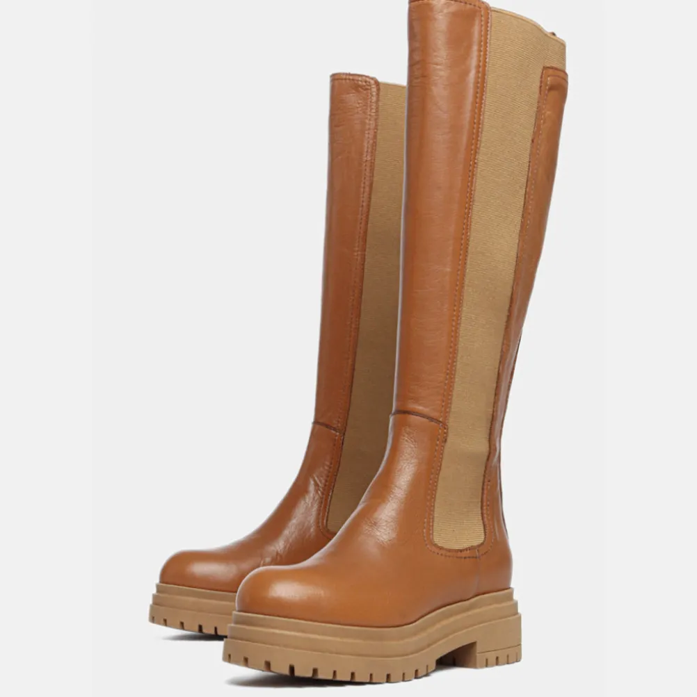 Farve: Camel / Materiale: Skind / Foer: Skind / Sål: Gummi / Sålhøjde: 4 cm. / Skafthøjde: 36 cm. (i str. 37) / Skaftvidde, top: 17 cm (i str. 37)