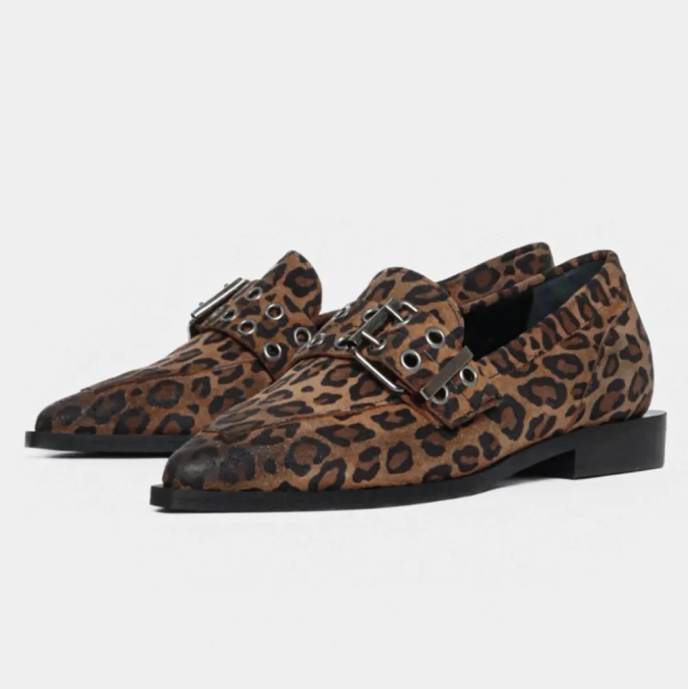 Flotte loafers i ruskind fra Bukela med leopardprint. Med spids snude og spænde. Kan styles til det meste, både jeans, bukser kjoler osv.