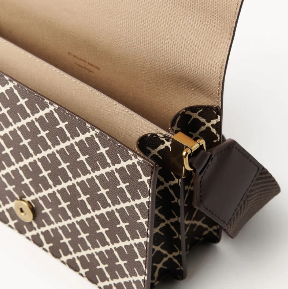 Lækker og klassisk populær skuldertaske med læderdetaljer fra Malene Birger med det velkendte signaturmønster. Med aftagelig og justerbar bomuldsrem. Magnetisk lukning.