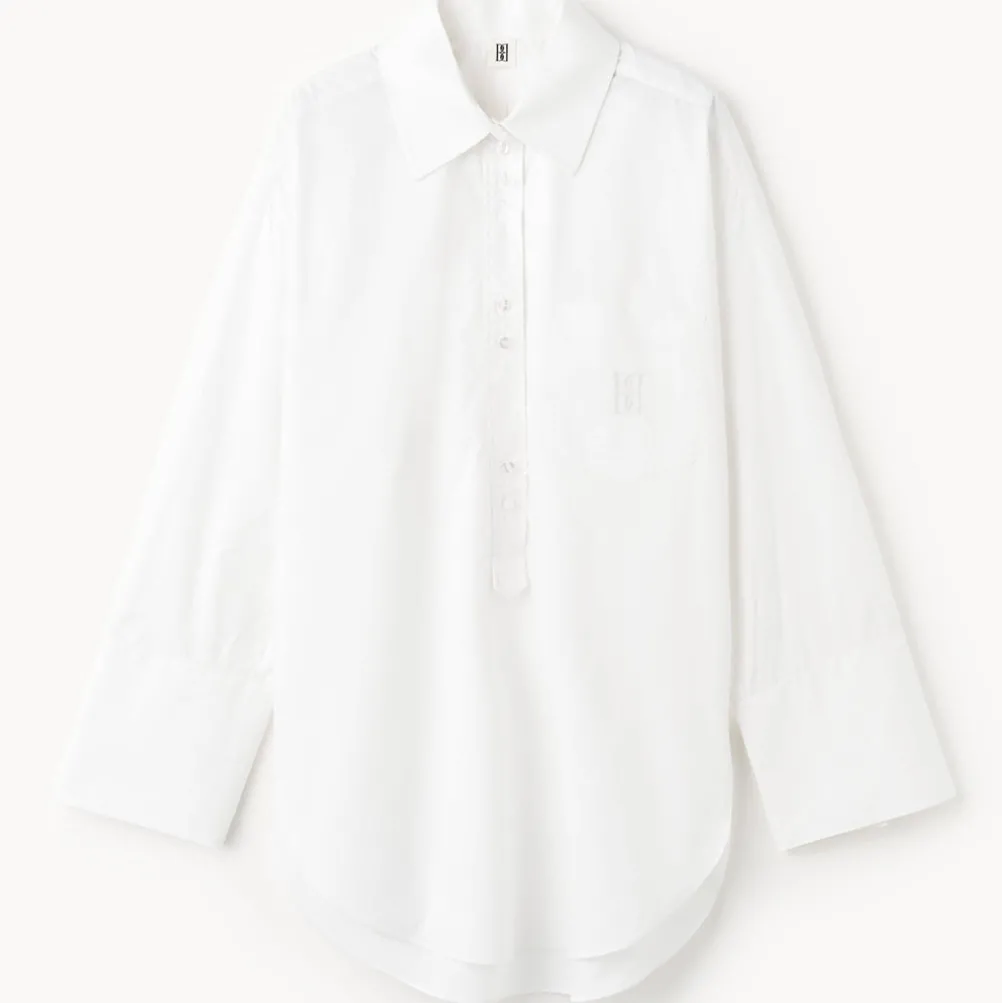 Smuk klassisk løs skorte med brystlomme med broderet monogram fra By Malene Birger. Med klassisk krave og brede manchetter.