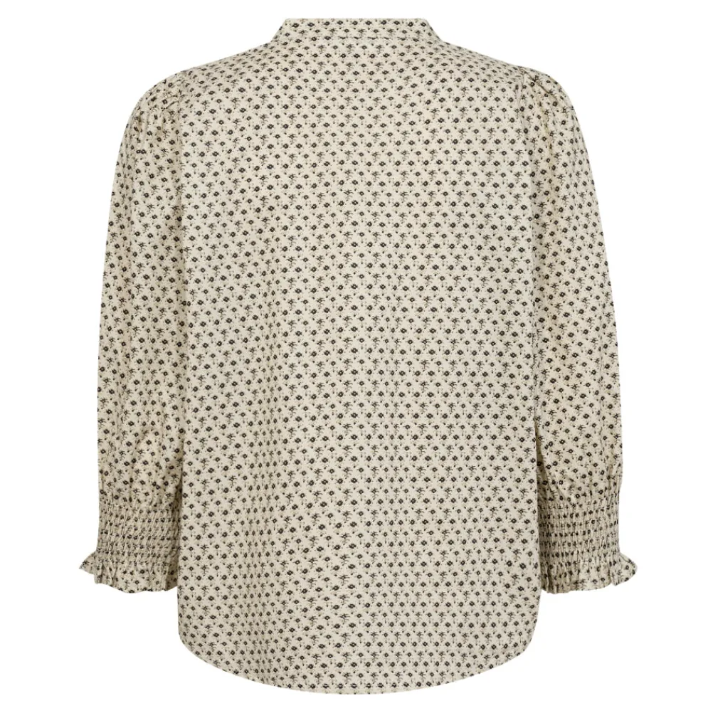 Flot og elegant bluse fra Co’couture med mønster. Med smock ved ærmerne og lille v-udskæring med knapper. Små flæser på brystet og ved ærmerne.