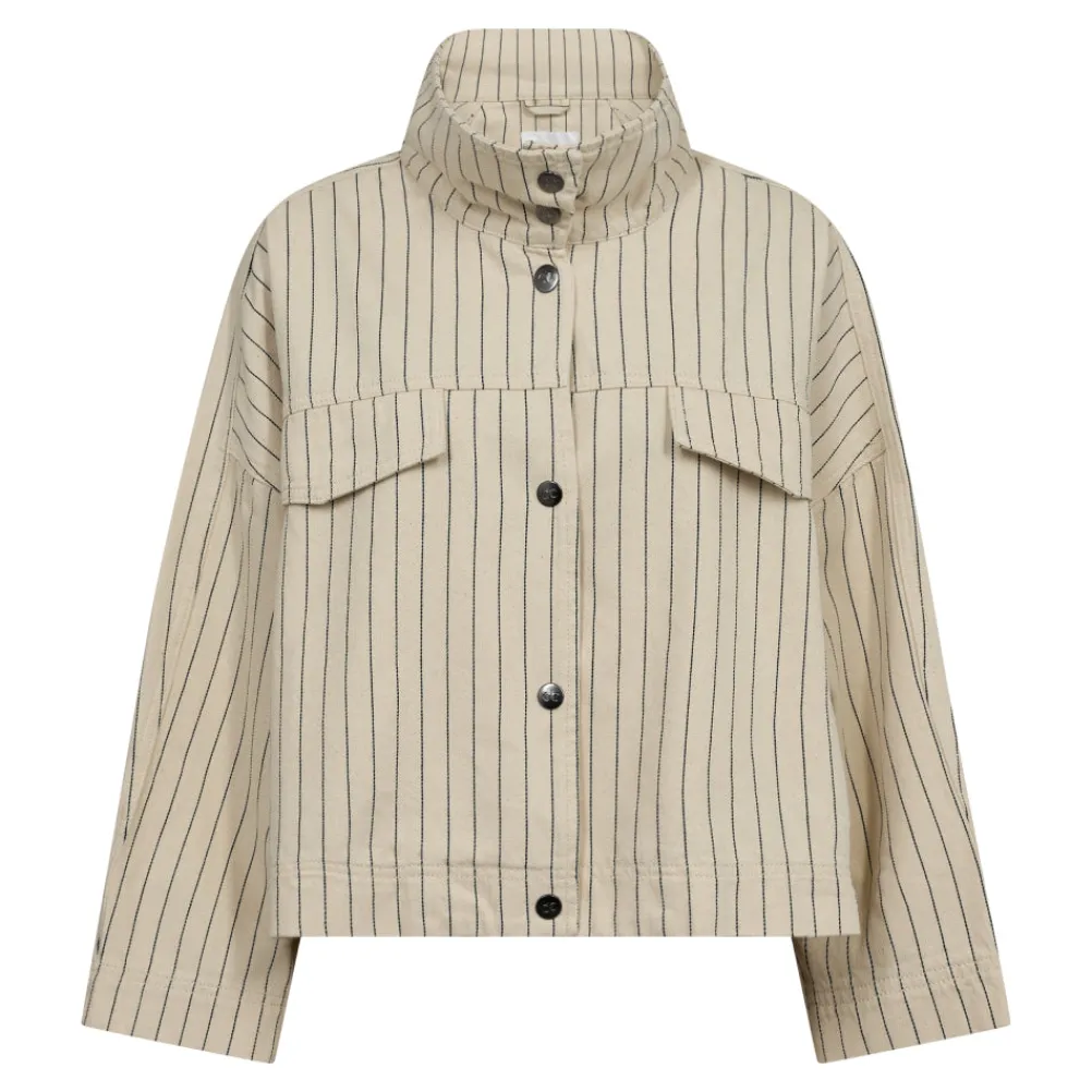 Super cool pinstripe box fit jakke fra Co’couture med høj hals og store lommer ved brystet. Lukkes med trykknapper ned foran.