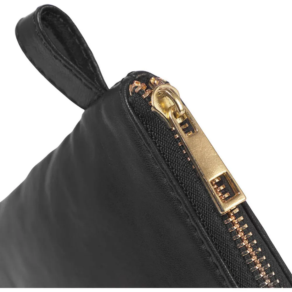 Flot clutch lavet i blødt fåreskind. Pungen har et primært rum med plads til pung og mobil og en mindre lynlåslomme. Den lukkes med en lynlås i toppen.