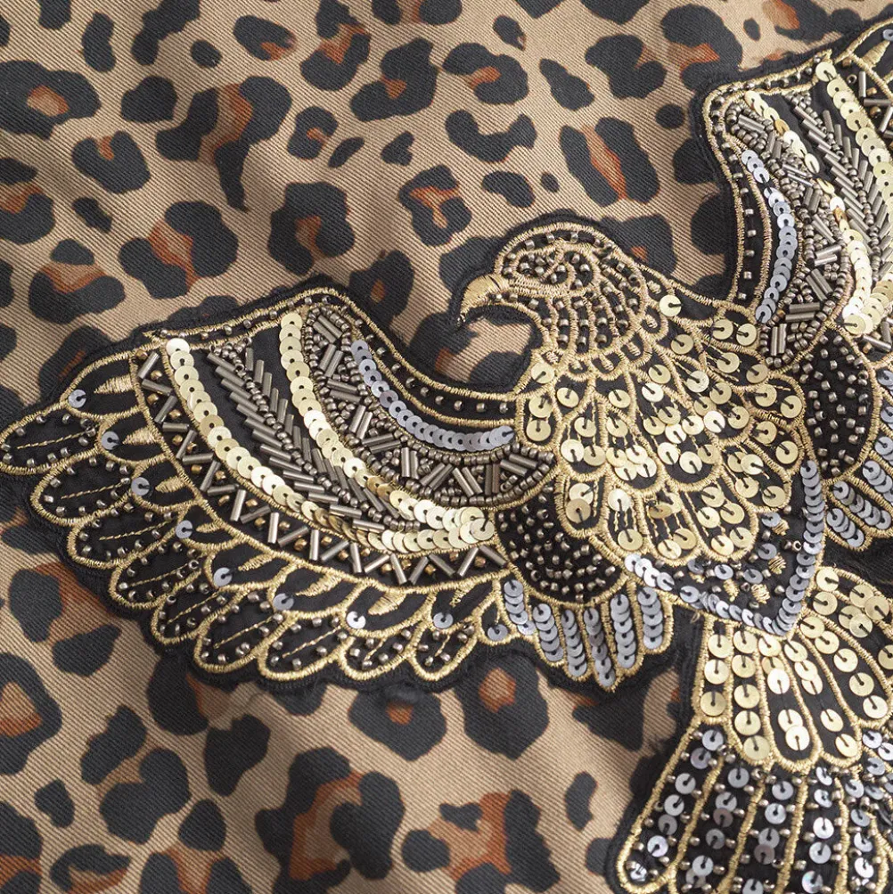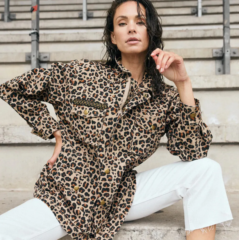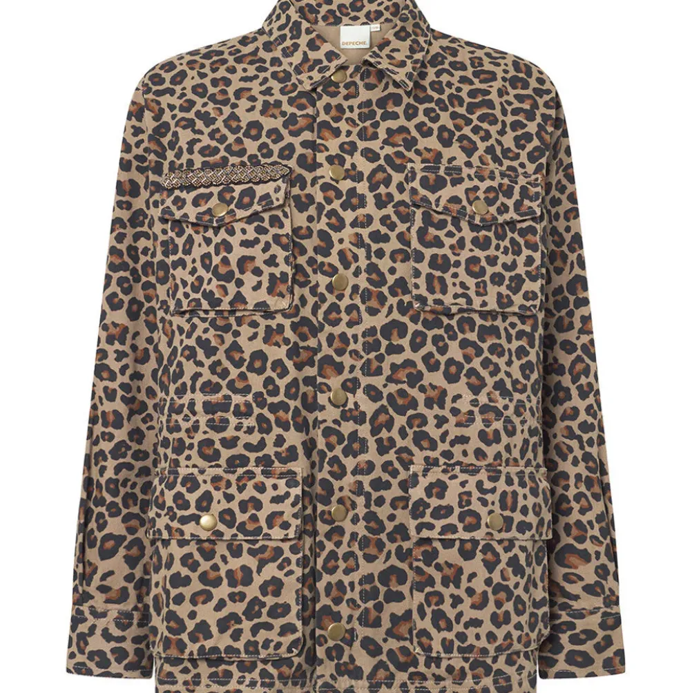 Super cool og flot jakke fra Depeche med leopardprint og fine detaljer! Jakken er dekoreret med lommer, smukke patches på lommen og ryggen og så lukkes den med lynlås og knapper. Kan snøres ind i taljen.
