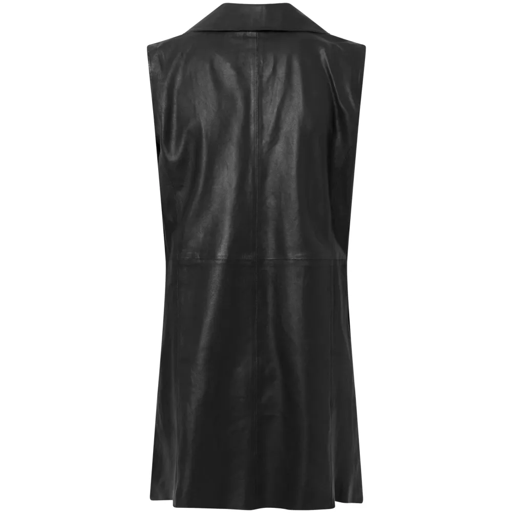 Super lækker sort skindvest fra Depeche. Lavet i en dejlig blød kvalitet. Lukkes med en enkelt knap foran. Style over bluser og kjoler.