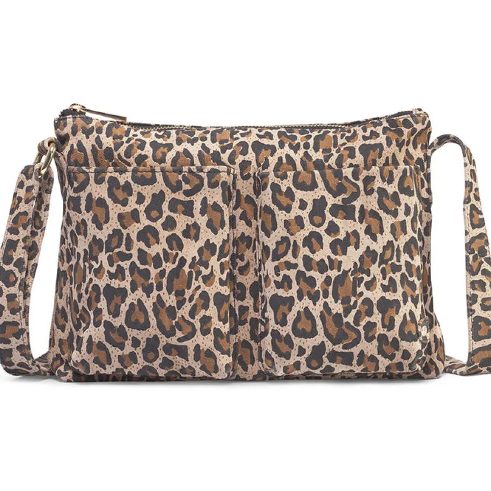 Flot crossover taske lavet i blødt skind med leopardprint. Tasken lukkes med lynlås i toppen og tasken indeholder et stort primært rum, samt en mindre lynlåslomme. Med store lommer på fronten.