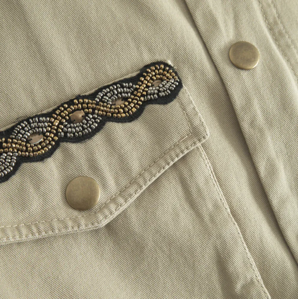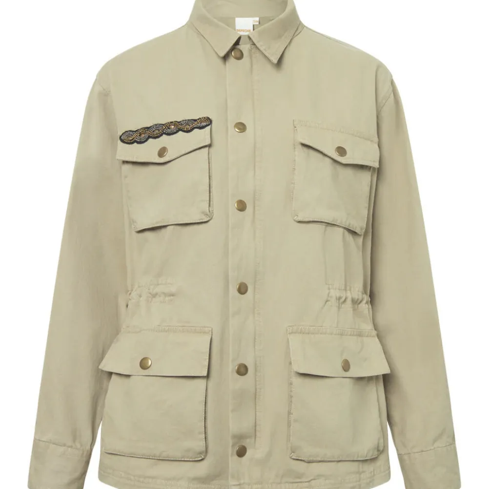 Super cool og flot jakke fra Depeche med fine detaljer! Jakken er dekoreret brystlommer, smukke patches på lommen og ryggen og så lukkes den med lynlås og knapper. Kan snøres ind i taljen.