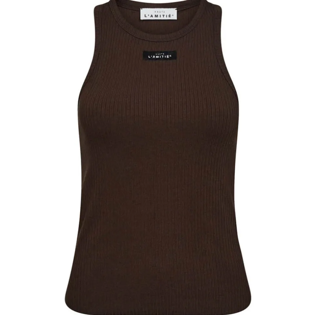 Klassisk enkel top fra Haute L’amitie i flot moccafarve med logo på brystet. Tæt pasform.