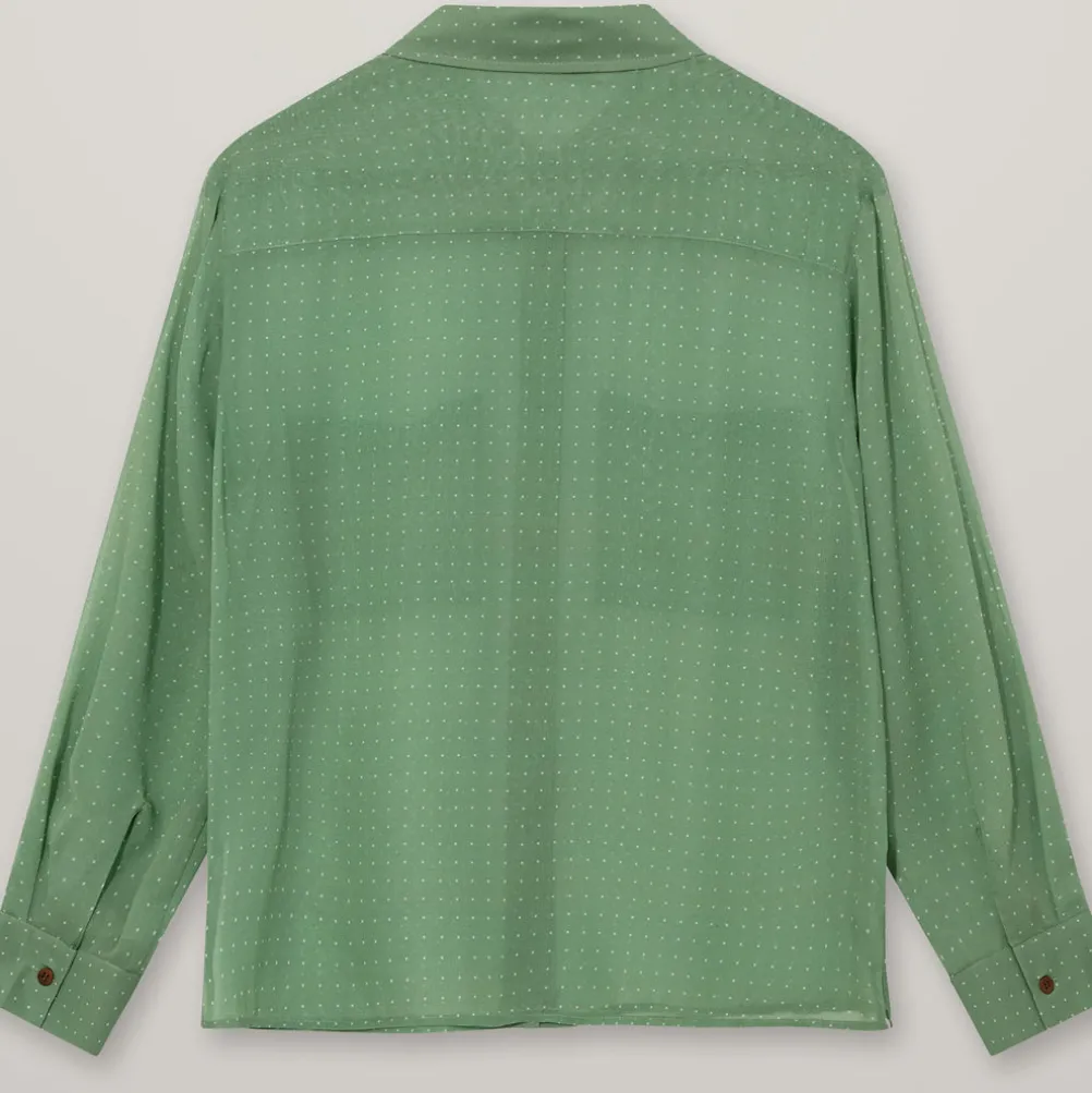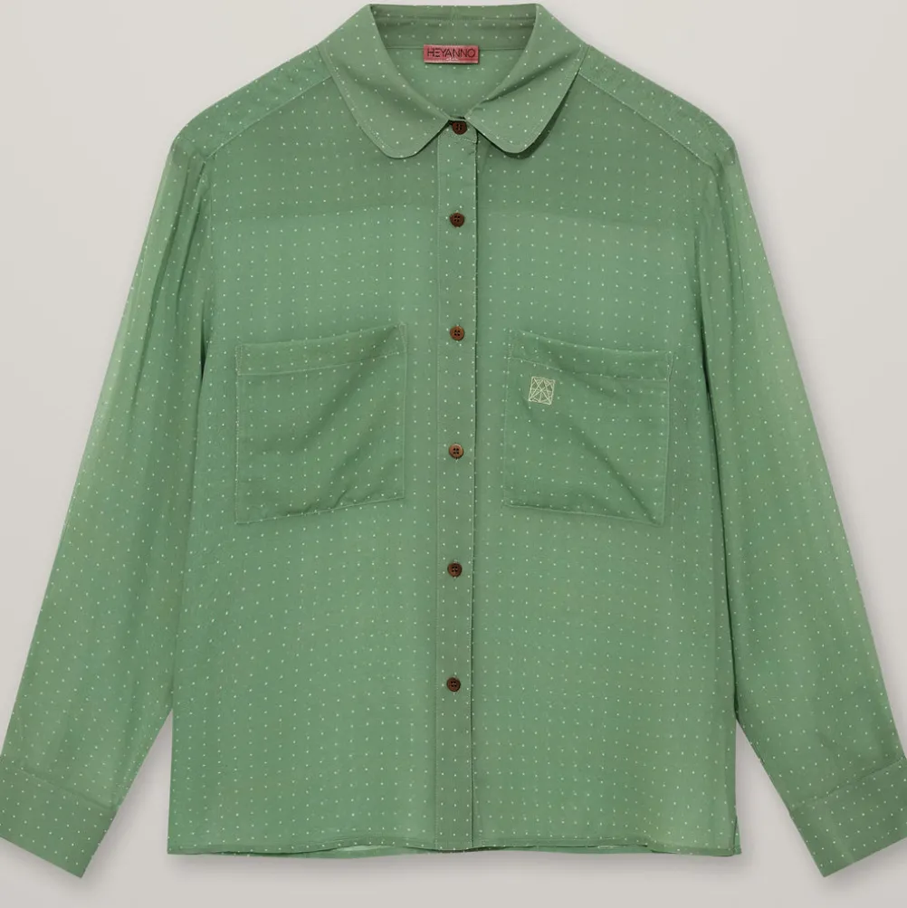 Smuk silkeskjorte fra Heyanno i flot grøn farve med fine detaljer! Med små prikker, mørke træknapper og anagram på lommen.
