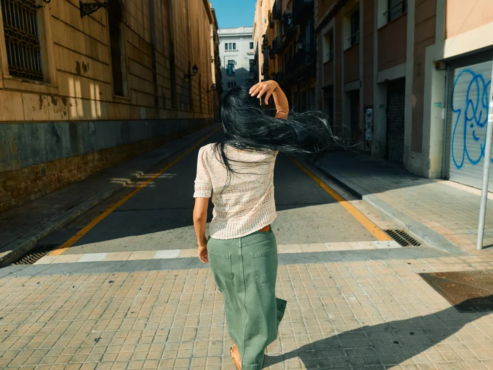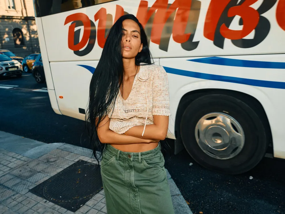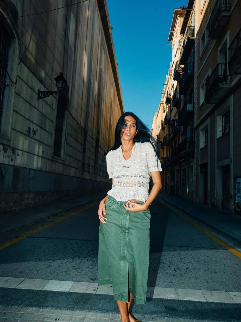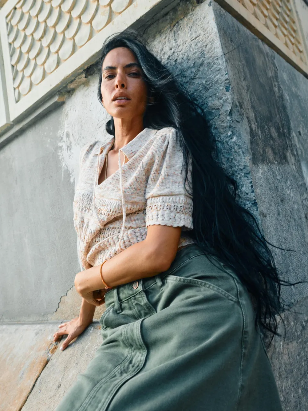 Skøn strik fra Hey Anno med fine detaljer! Med korte ærmer, åben krave med bindebånd og et let, åbenstrikket mønster.