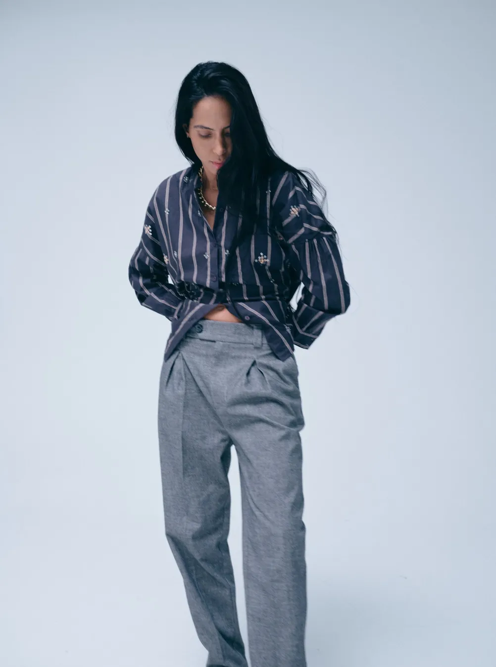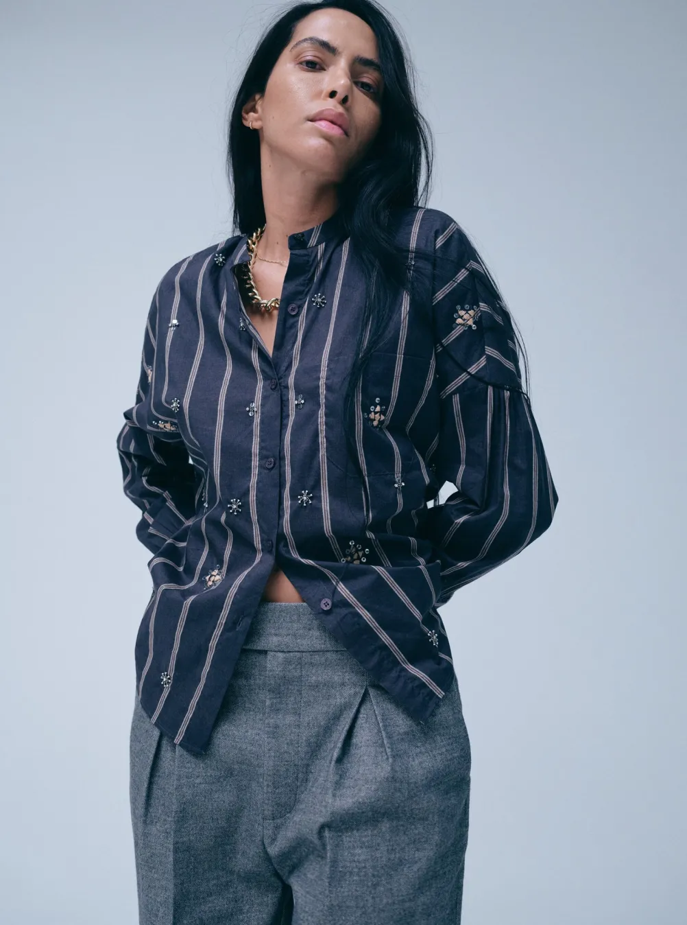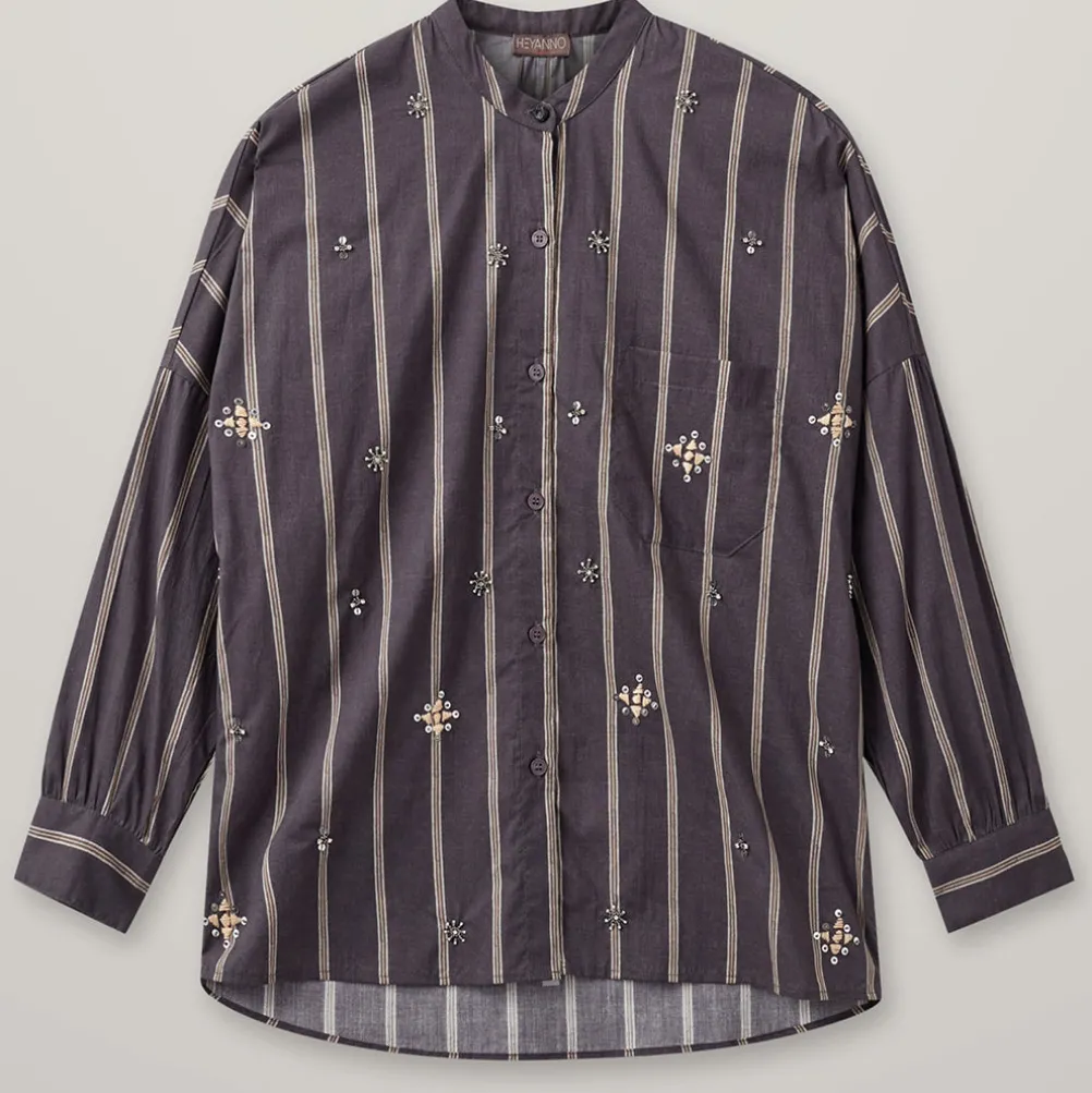 Smuk let skjorte fra Heyanno med striber og håndbroderede detaljer. Med sænkede skuldre og mandarinkrave.