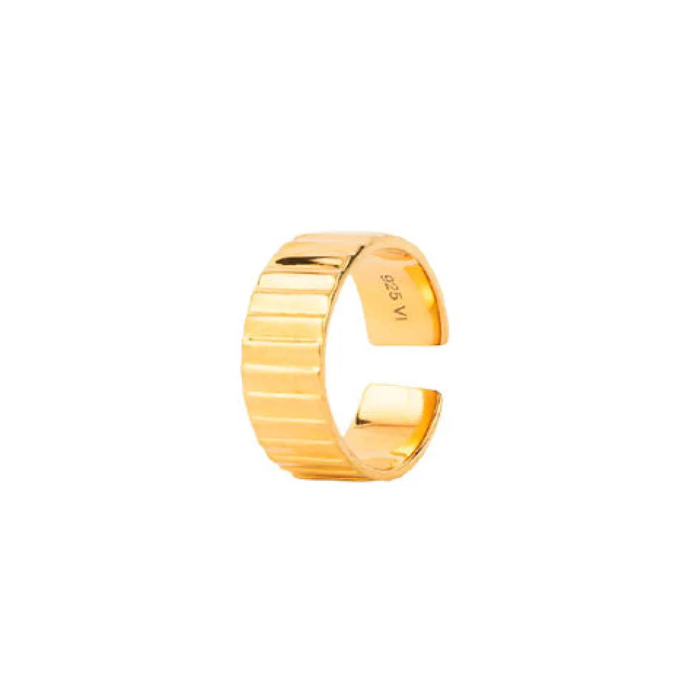 Cool og klassisk bred ring fra House Of Vincent. Ringen er forgyldt og har en fin rillet struktur hele vejen rundt. Ringen er one size og åben bagpå hvilket gør den justerbar og kan passe de fleste fingre.