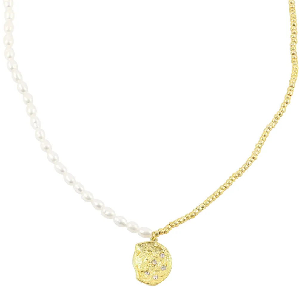 Smuk perlehalskæde med ferskvandsperler og små forgyldte perler, samt smukt vedhæng.