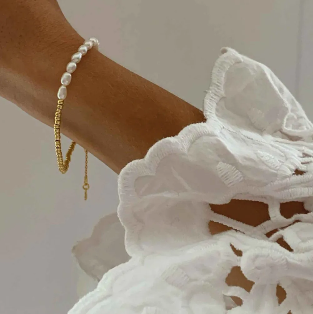Smukt armbånd med små ferskvandsperler og forgyldte perler.