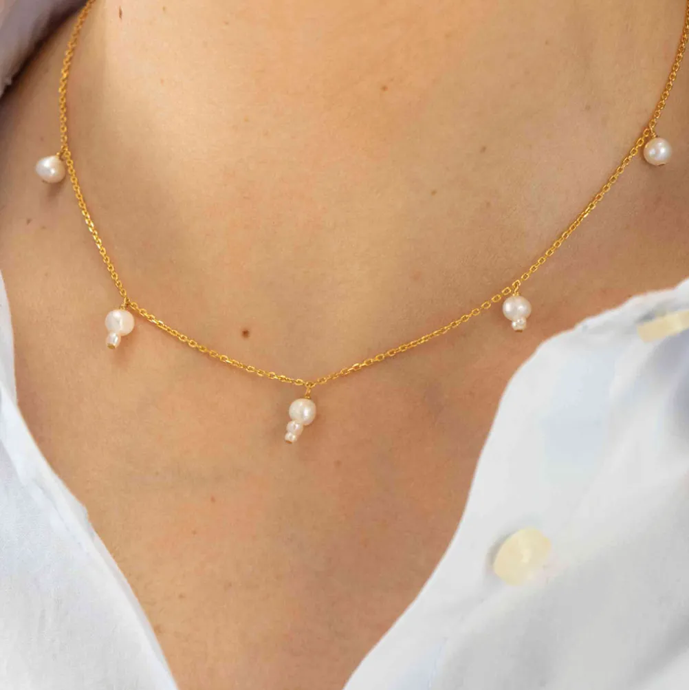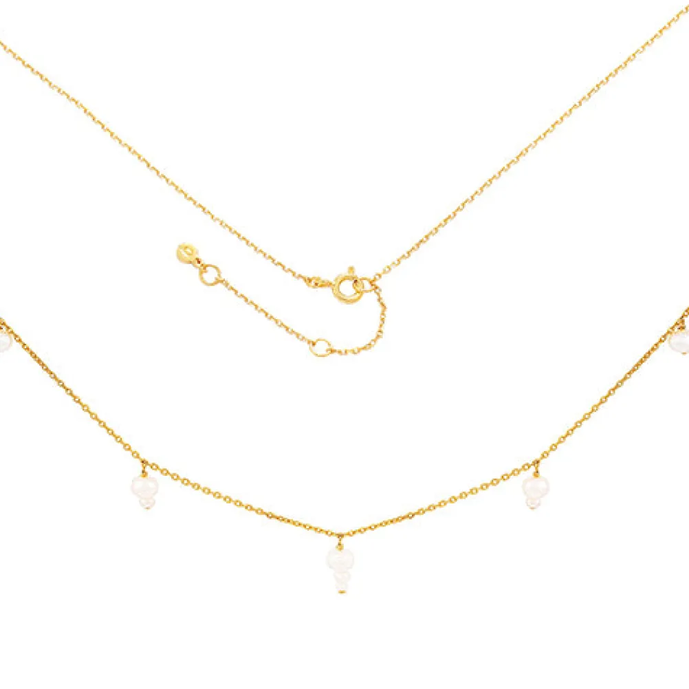 Materiale: 18K forgyldt sterlingsølv med 1 mikron og e-coating, hvide ferskvandsperler / Længde: 38 cm + 5 cm flex