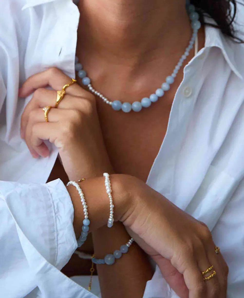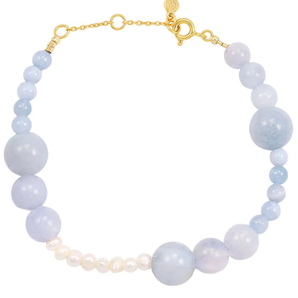 Smukt og unikt lyseblåt armbånd fra Hultquist Copenhagen med ferskvandsperler og glasperler i forskellige størrelser.