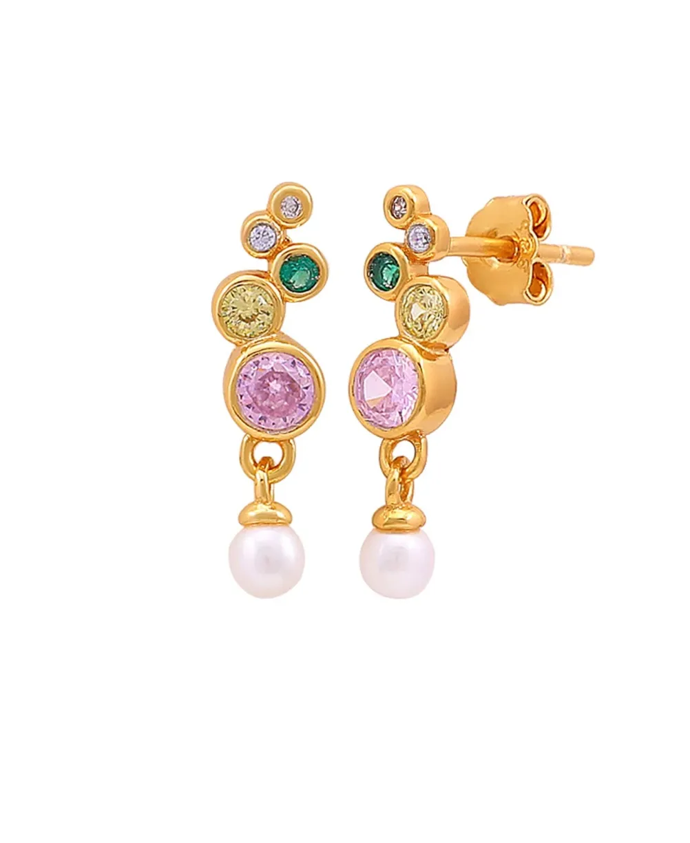 Smukke øreringe fra Hultquist Copenhagen med forskellige farver af sten og hvide perler.