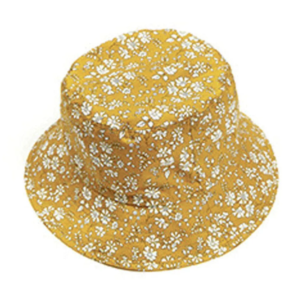 Smuk gul solhat/bøllehat i det fineste Liberty blomsterprint fra Huttelihut. Perfekt til at skygge for solens skarpe stråler.