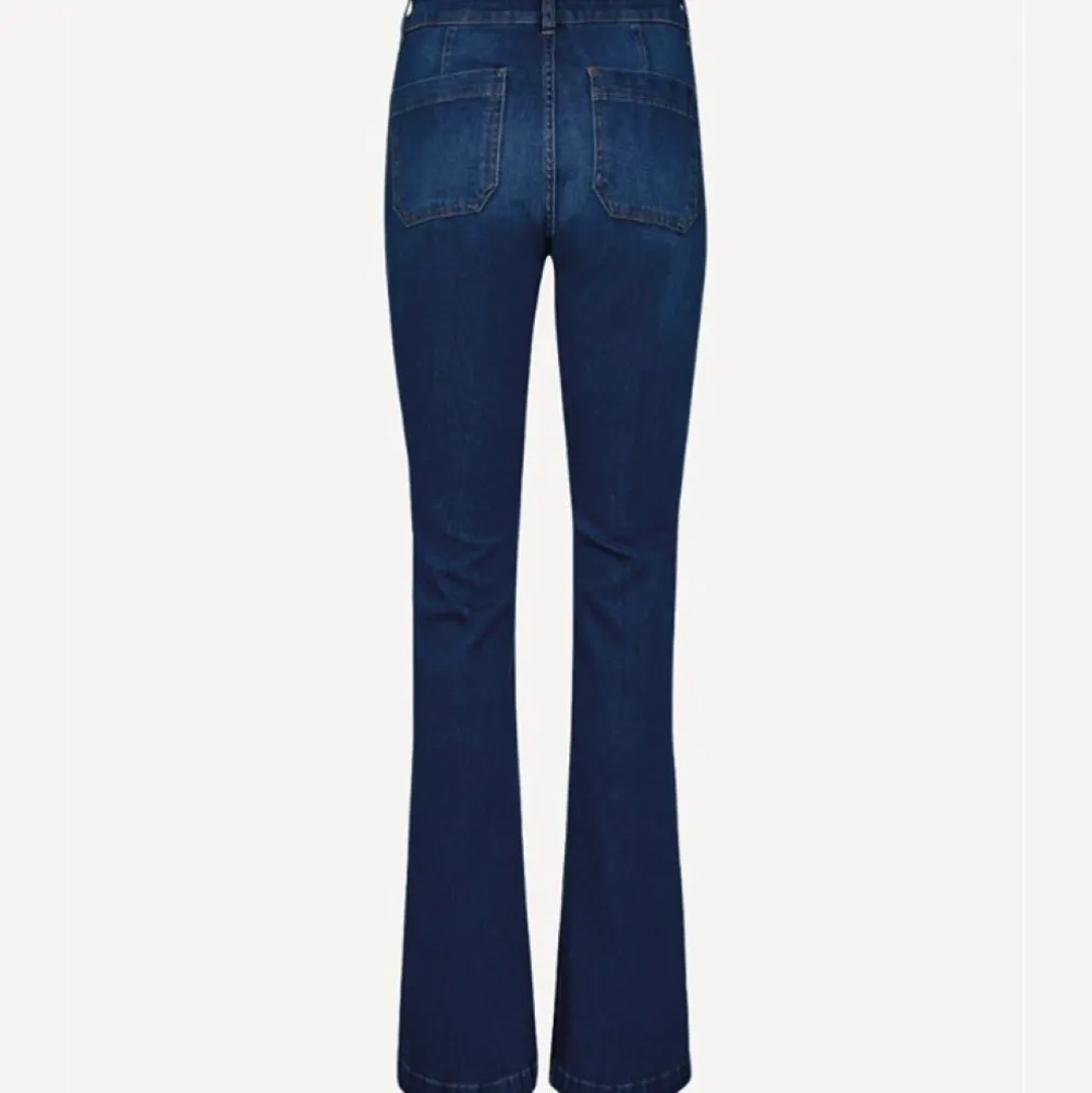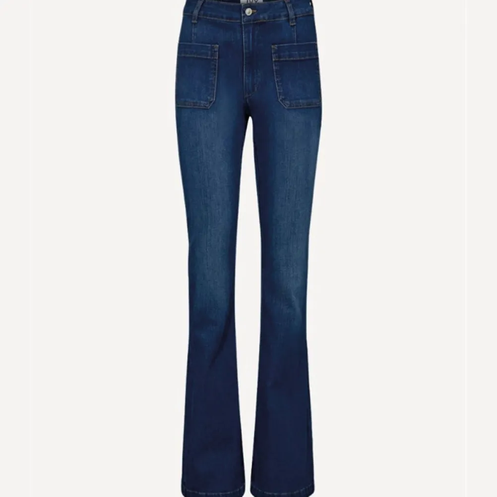 Lækre jeans i flot mørkeblå denim fra Ivy Copenhagen. Bukserne har skinny fit med flare forneden og mellemhøj talje. Bukserne er meget bløde og komfortable og har stretch. Patch-lommer med lynlås og knap.