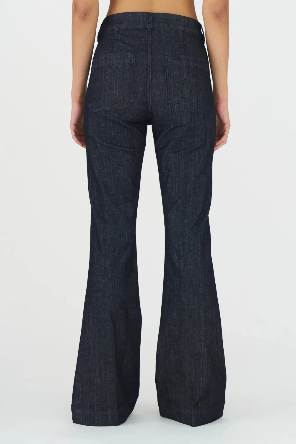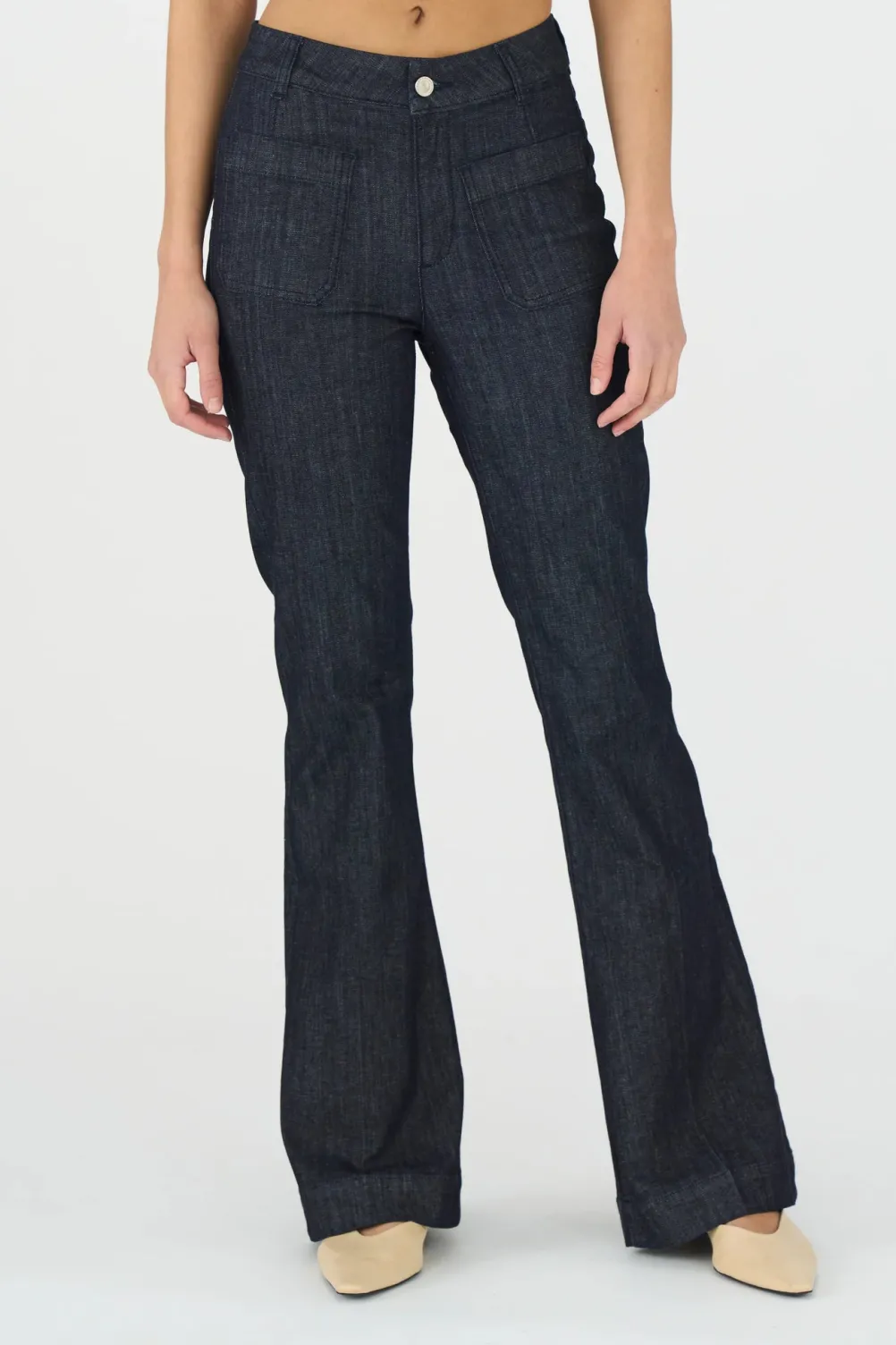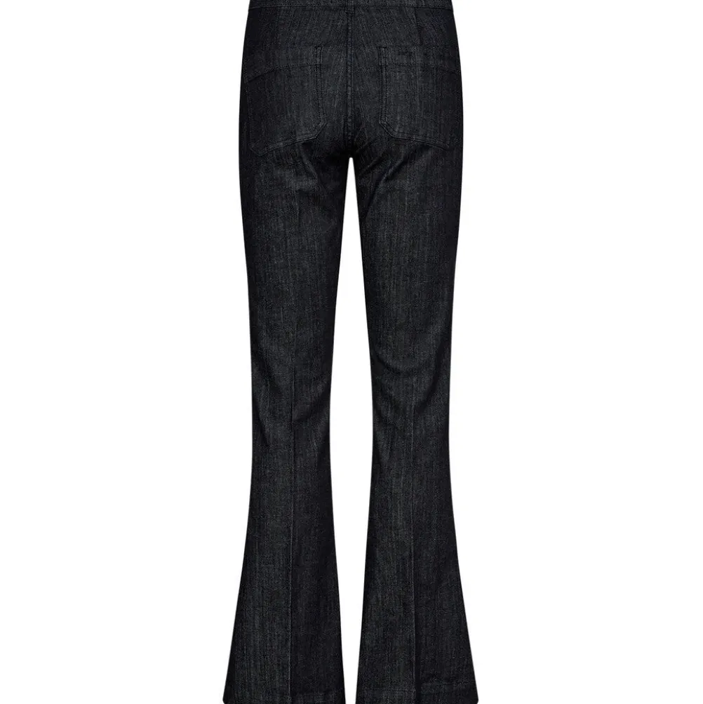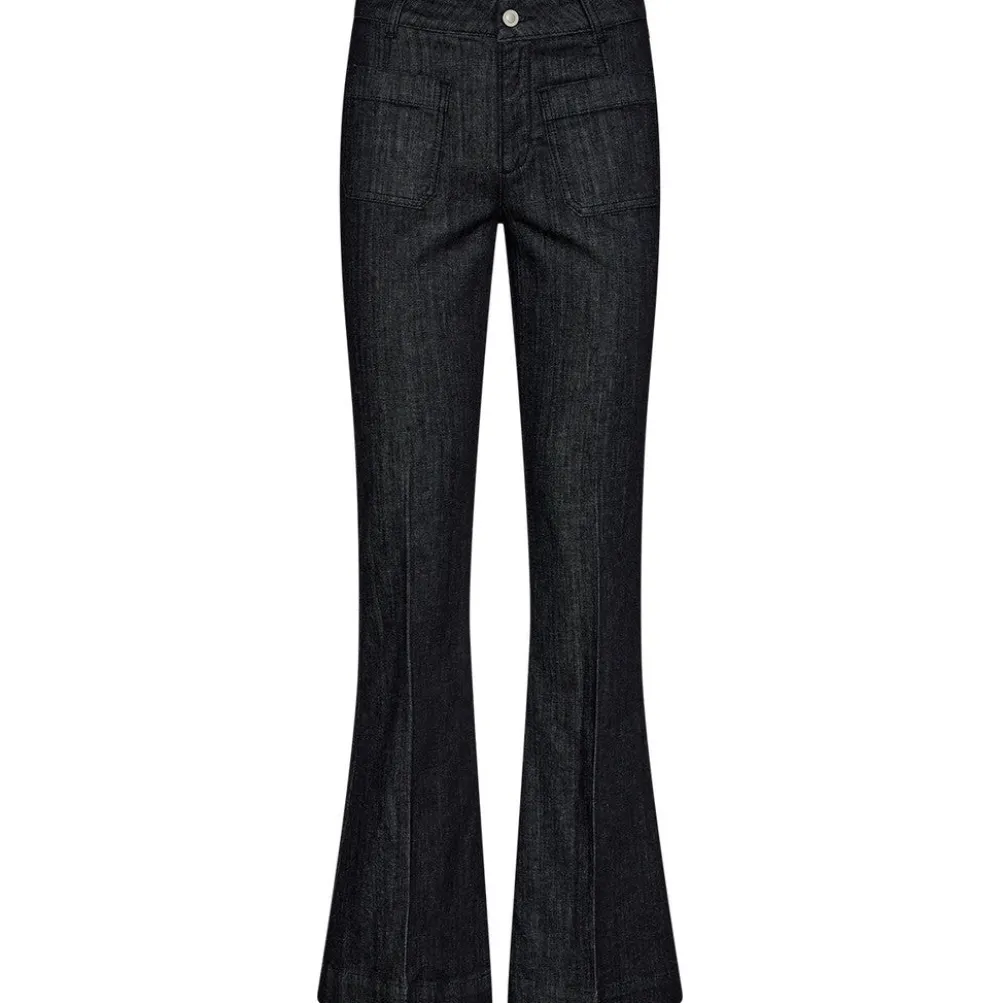 Lækre jeans i flot mørkeblå denim fra Ivy Copenhagen. Bukserne har skinny fit med flare forneden og mellemhøj talje. Bukserne er meget bløde og komfortable og har stretch. Patch-lommer med lynlås og knap.