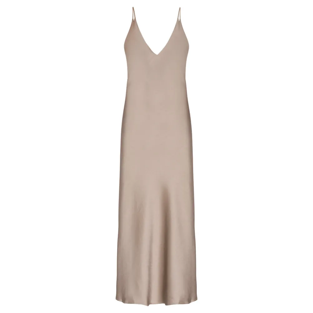 Smuk satinkjole fra Karmamia med v-udskæring og tynde stropper. Kjolen smyger sig luksuriøst om kroppen – perfekt til festlige begivenheder.