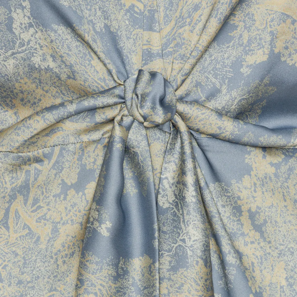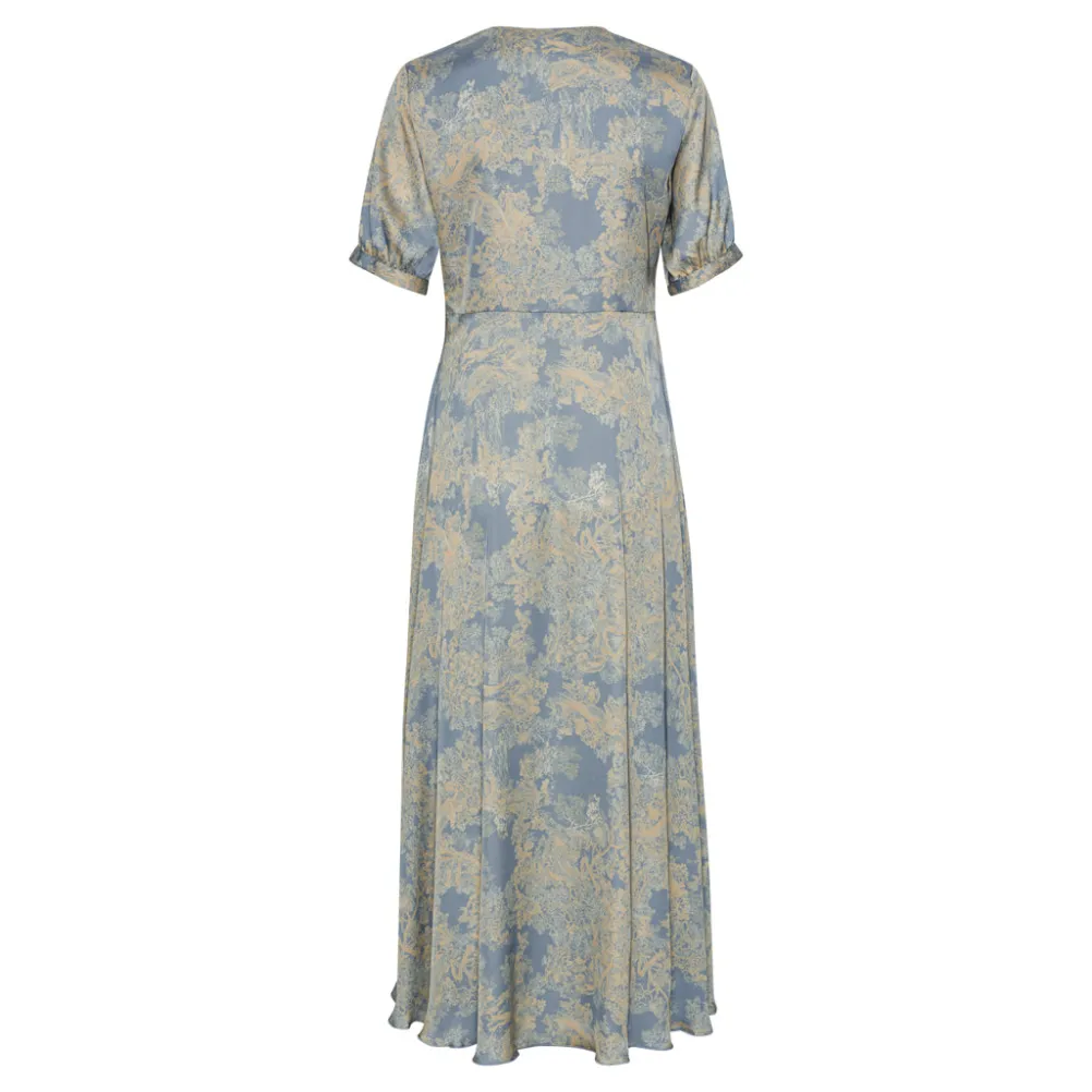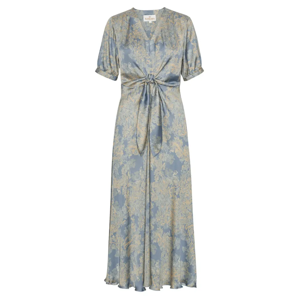 Smuk maxikjole fra Karmamia med v-udskæring og fin knudedetalje. Med smukt diskret print. Perfekt både til hverdag og fest.