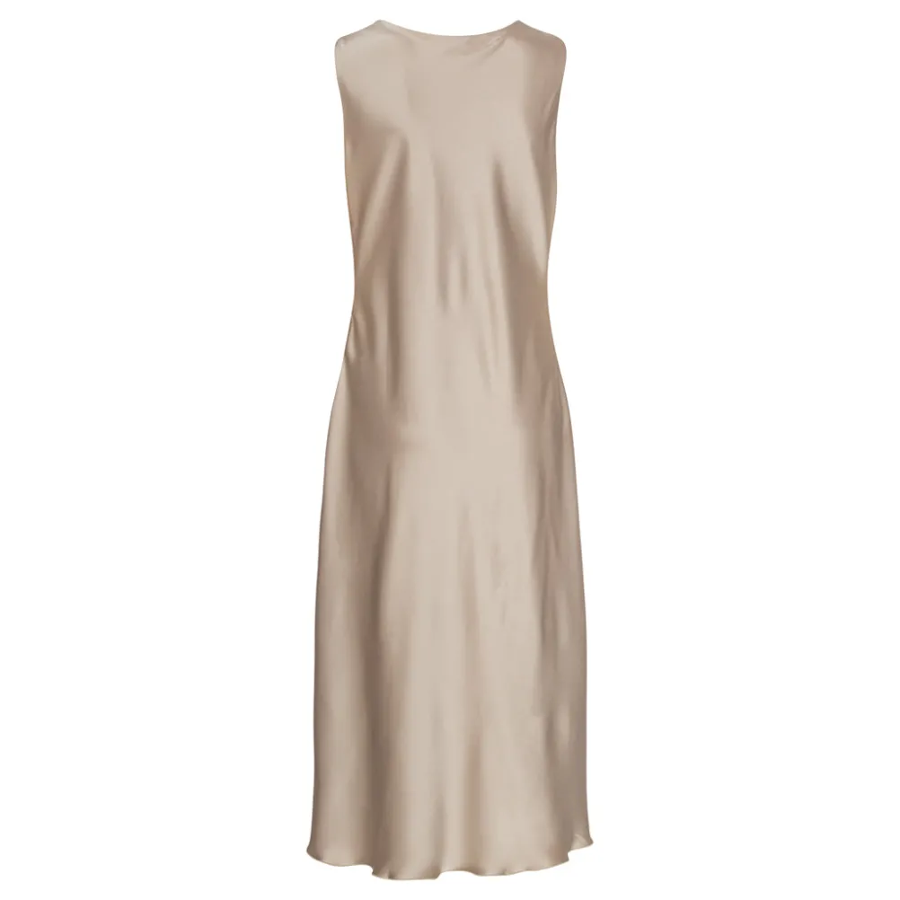 Super smuk satinkjole fra Karmamia med rund draperet udskæring og indsnit i taljen. Kjolen smyger sig luksuriøst om kroppen – perfekt til festlige begivenheder.