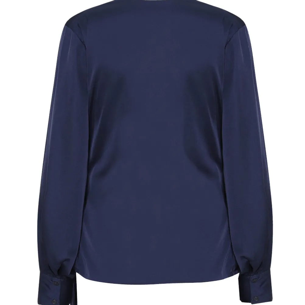Smuk mørkeblå bluse i satin med slå-om detalje og lange ærmer, som kan styles på mange måder. Perfekt både til hverdag og fest.