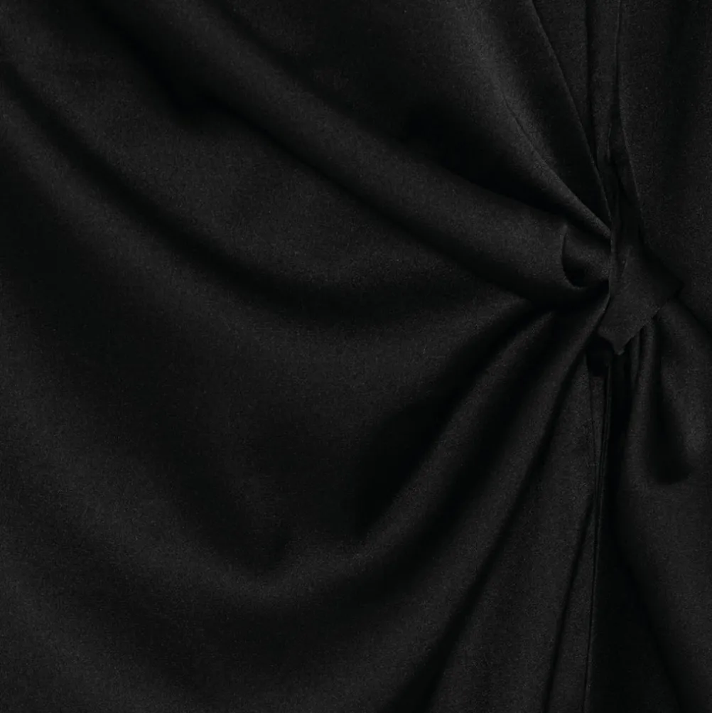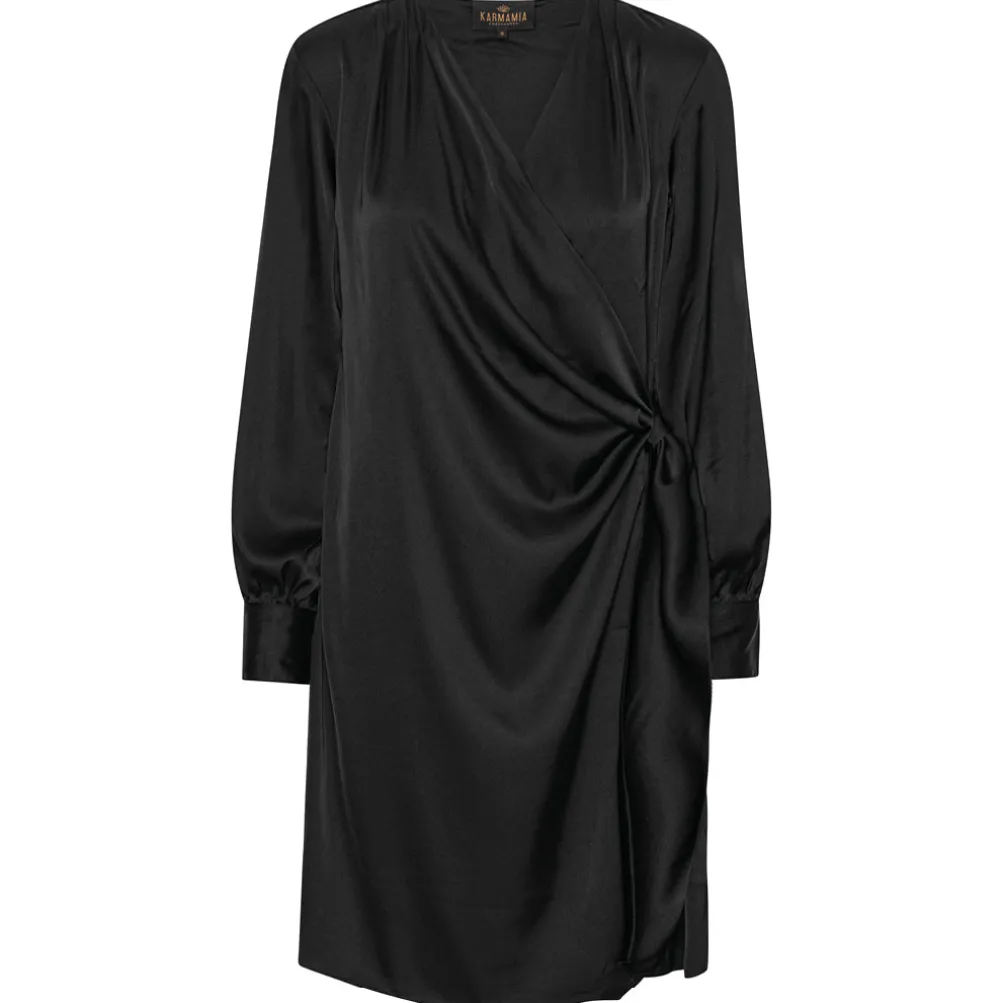 Super smuk sort satinkjole med slå-om detalje og lange ærmer fra Karmamia. Perfekt både til hverdag og fest.