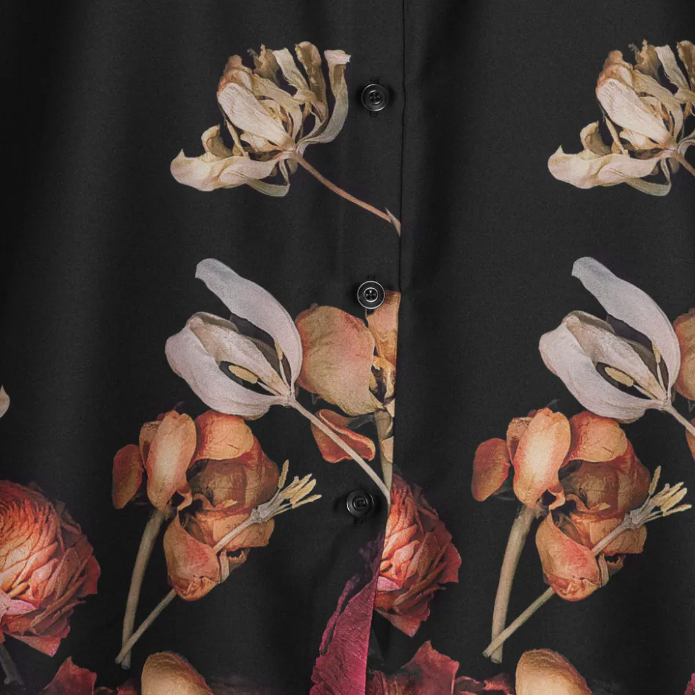 Super smuk og elegant satinskjorte fra Karmamia med flot blomsterprint forneden. Med klassisk krave og manchetter. Kan bruges både til hverdag og fest.