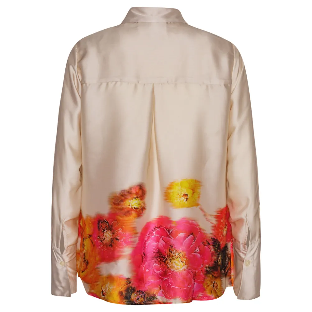 Super smuk og elegant satinskjorte fra Karmamia med flot blomsterprint forneden. Med klassisk krave og manchetter. Kan bruges både til hverdag og fest.