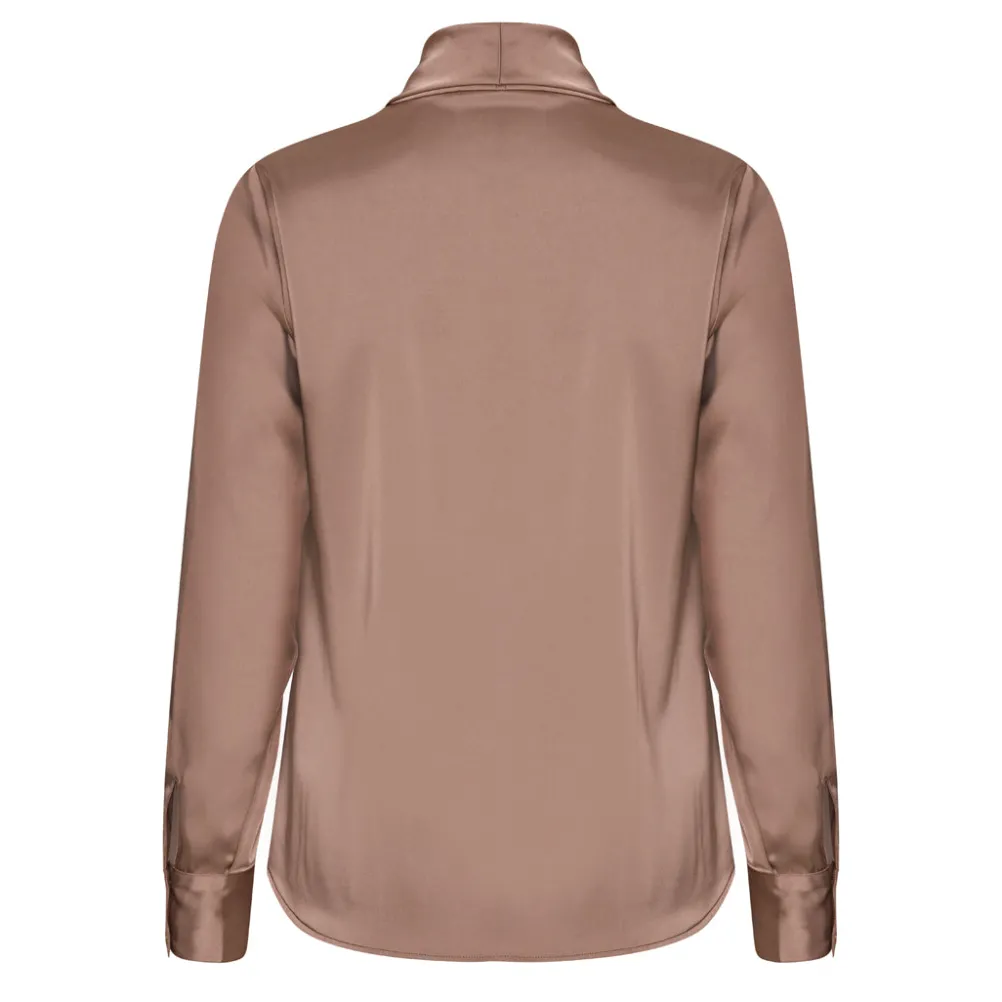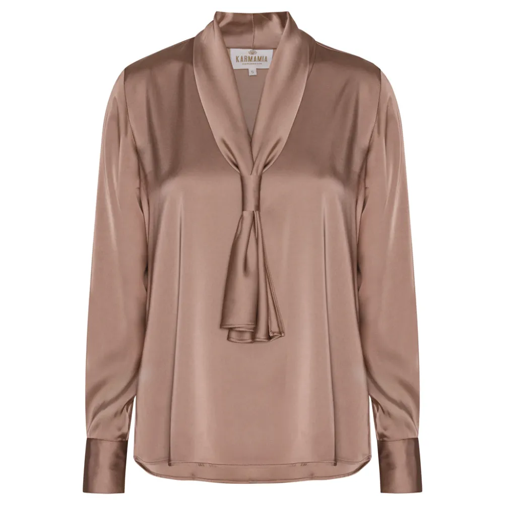 Smuk bluse fra Karmamia i semi rig satin med v-udskæring, sløjfedetaljer og lange ærmer, som kan styles på mange måder. Perfekt både til hverdag og fest.