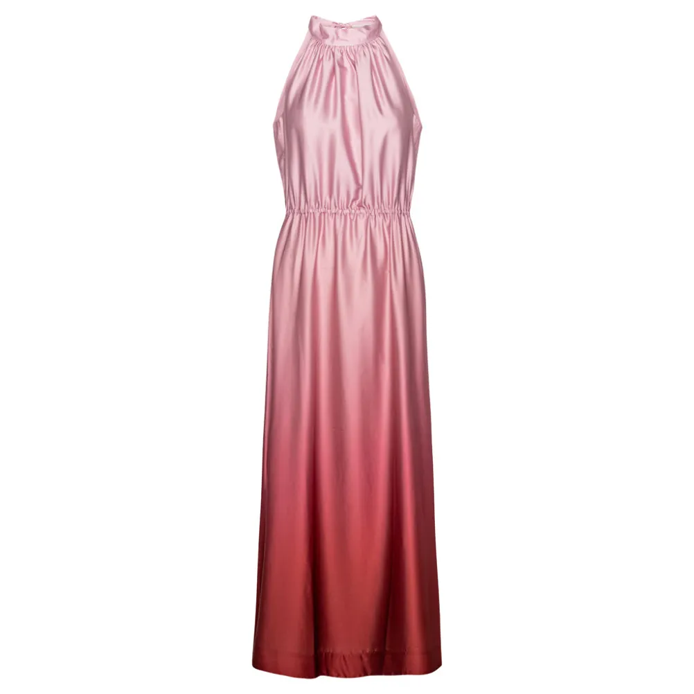 Super smuk satinkjole fra Karmamia med gradient farve og bindebånd i taljen. Med høj hals og elegante bånd i nakken. Perfekt til festlige begivenheder.