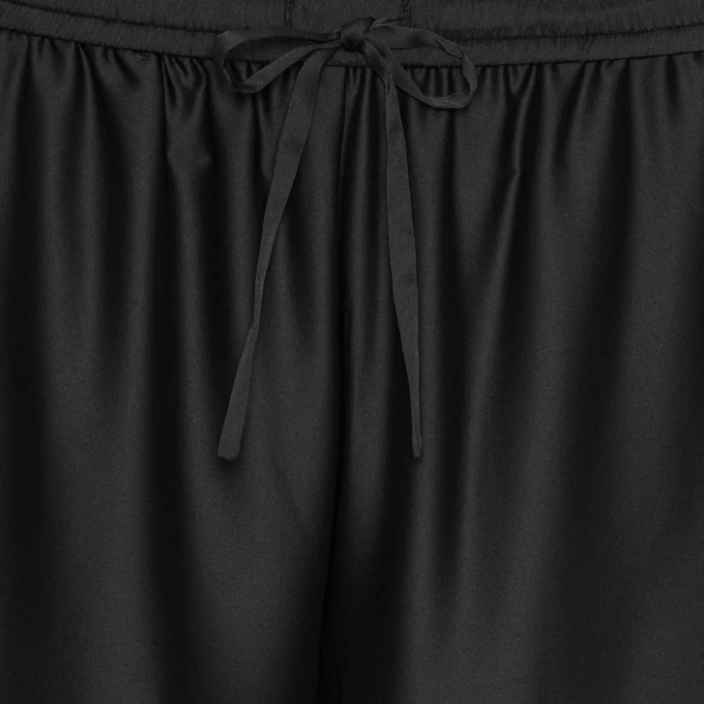 Smukke løse sorte satinbukser fra Karmamia med blomstermønster forneden og bindebånd i taljen og brede ben. Perfekte til både hverdag og fest.