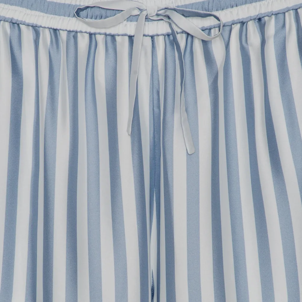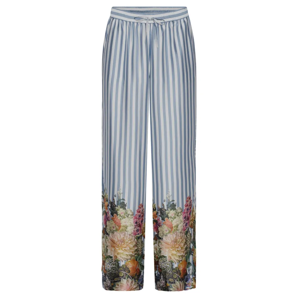 Smukke løse satinbukser fra Karmamia med striber og blomstermønster og bindebånd i taljen og brede ben. Perfekte til både hverdag og fest. Kan med fordel styles med den matchende skjorte.