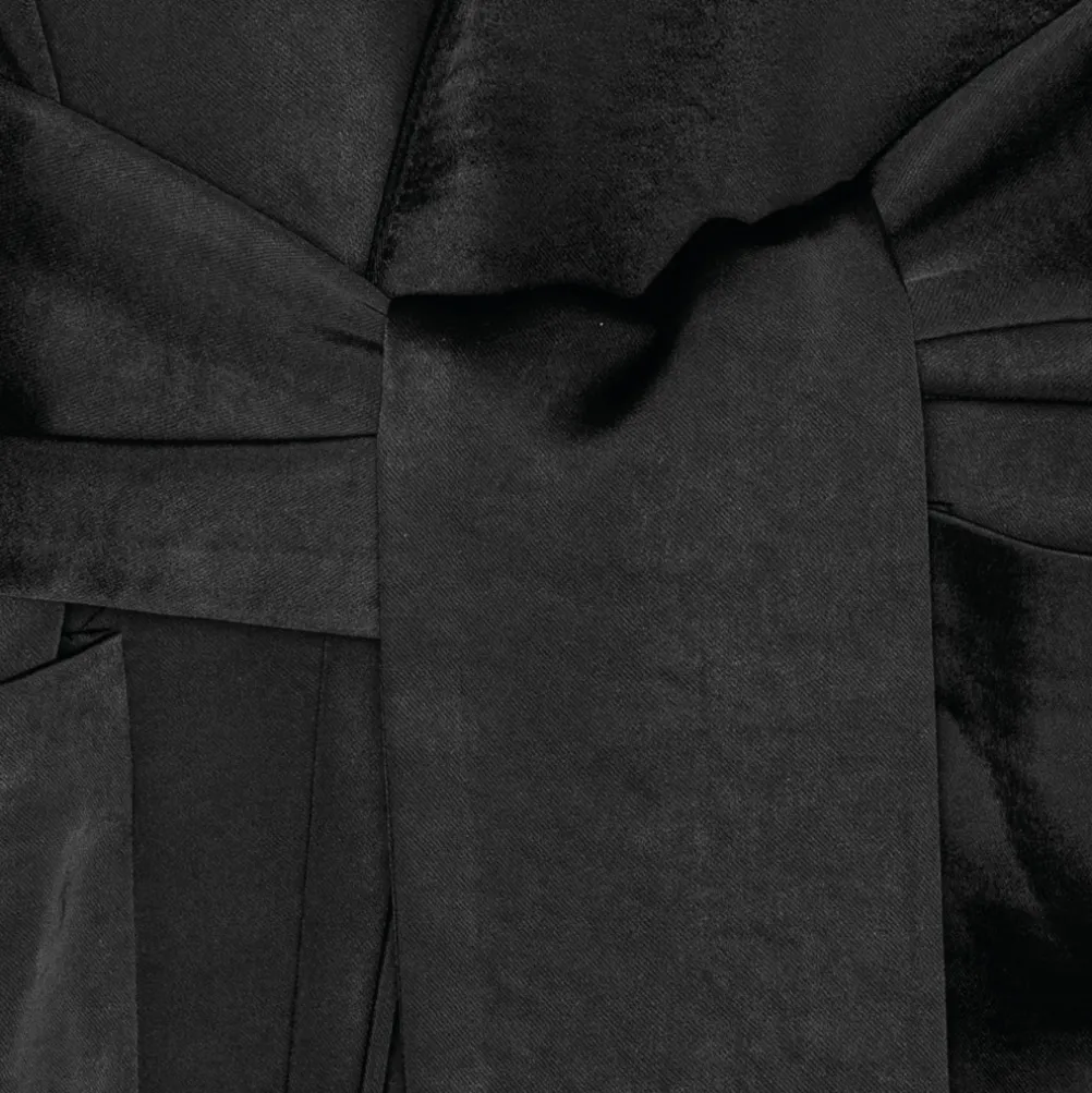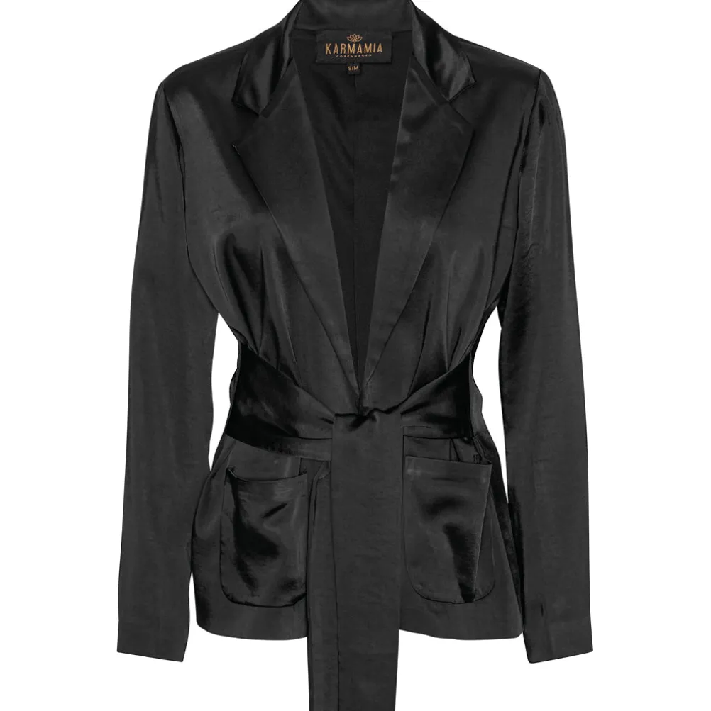 Smuk sort satinblazer fra Karmamia med lange ærmer og bindebånd i taljen, som kan styles på mange måder. Perfekt både til hverdag og fest.