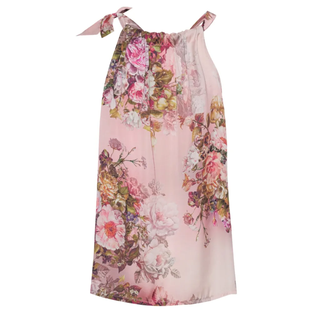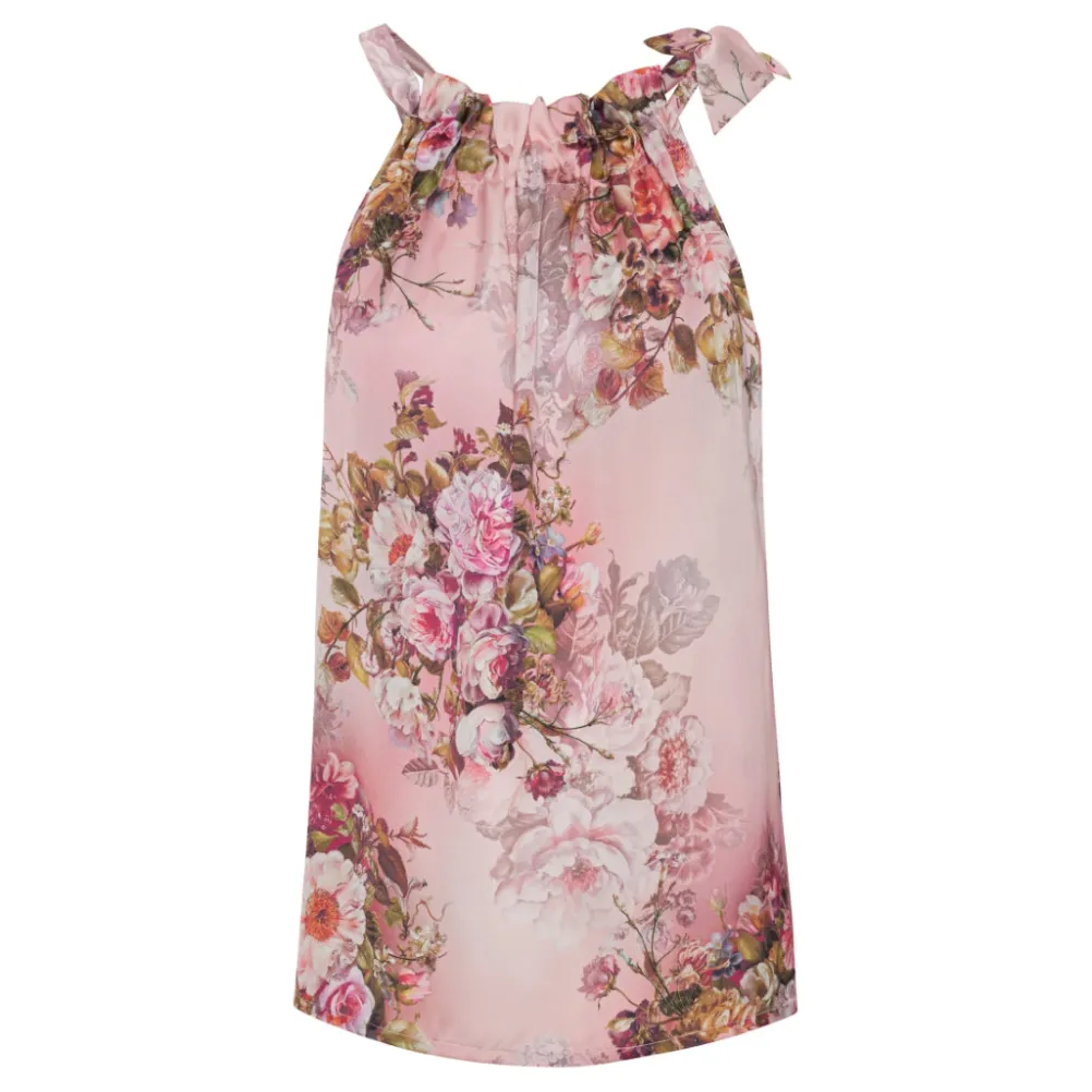 Smuk satintop med flot blomsterprint fra Karmamia. Toppen har høj hals, som bindes med et bånd i siden. Perfekt både til hverdag og fest.