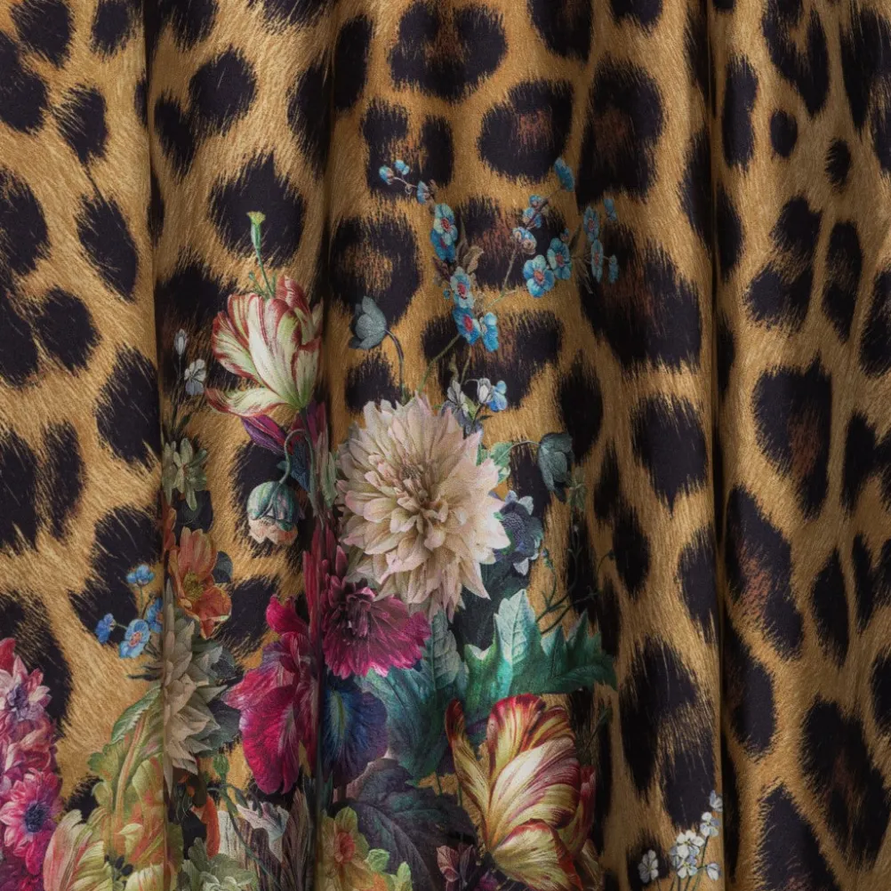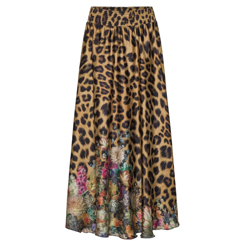 Super smuk satinnederdel fra Karmamia med det smukkeste leopardprint med blomster forneden. Kan med fordel styles med den matchende bluse eller top.
