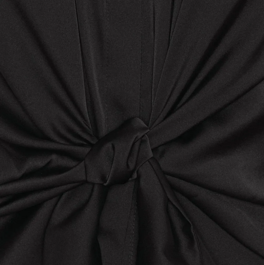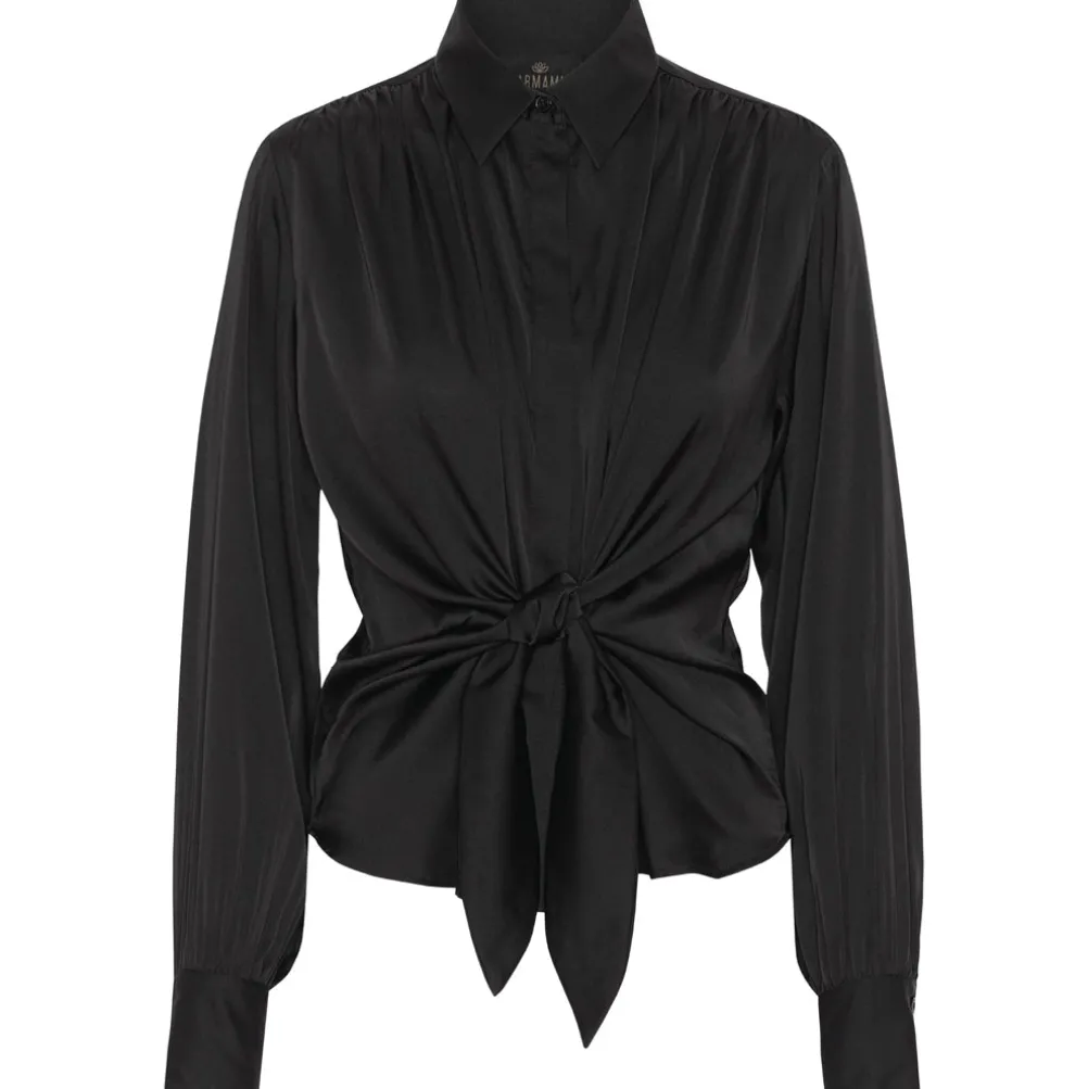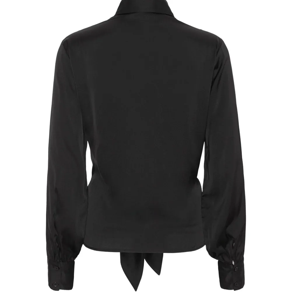 Smuk satinskjorte med knudeffekt, som fremhæver taljen. Skjorten har lange ærmer og klassisk krave og kan styles på mange måder. Perfekt både til hverdag og fest.