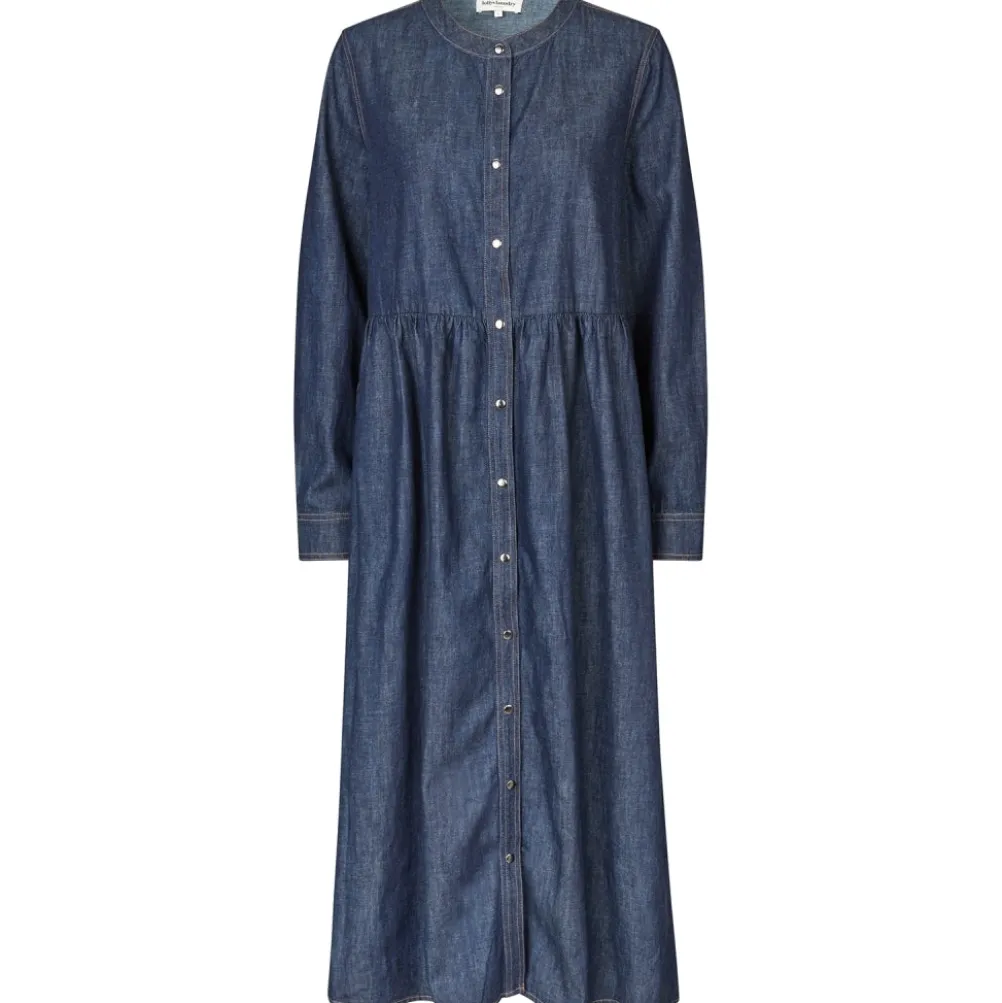 Super cool lang denimkjole fra Lollys Laundry med trekvartlange ærmer, små fine knapper og indsnit i taljen. Modellen er iklædt en str. M.