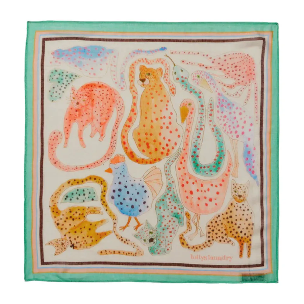 Smukt tørklæde med dyremotiver og flot farve fra Lollys Laundry.
